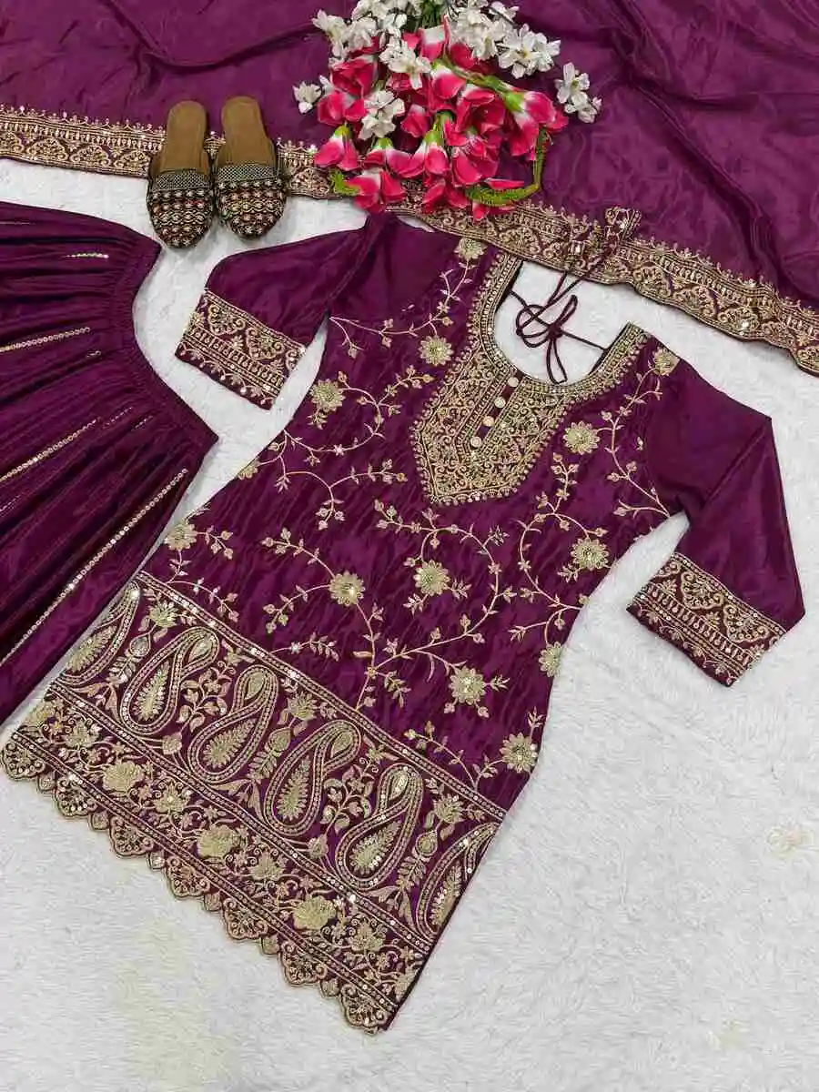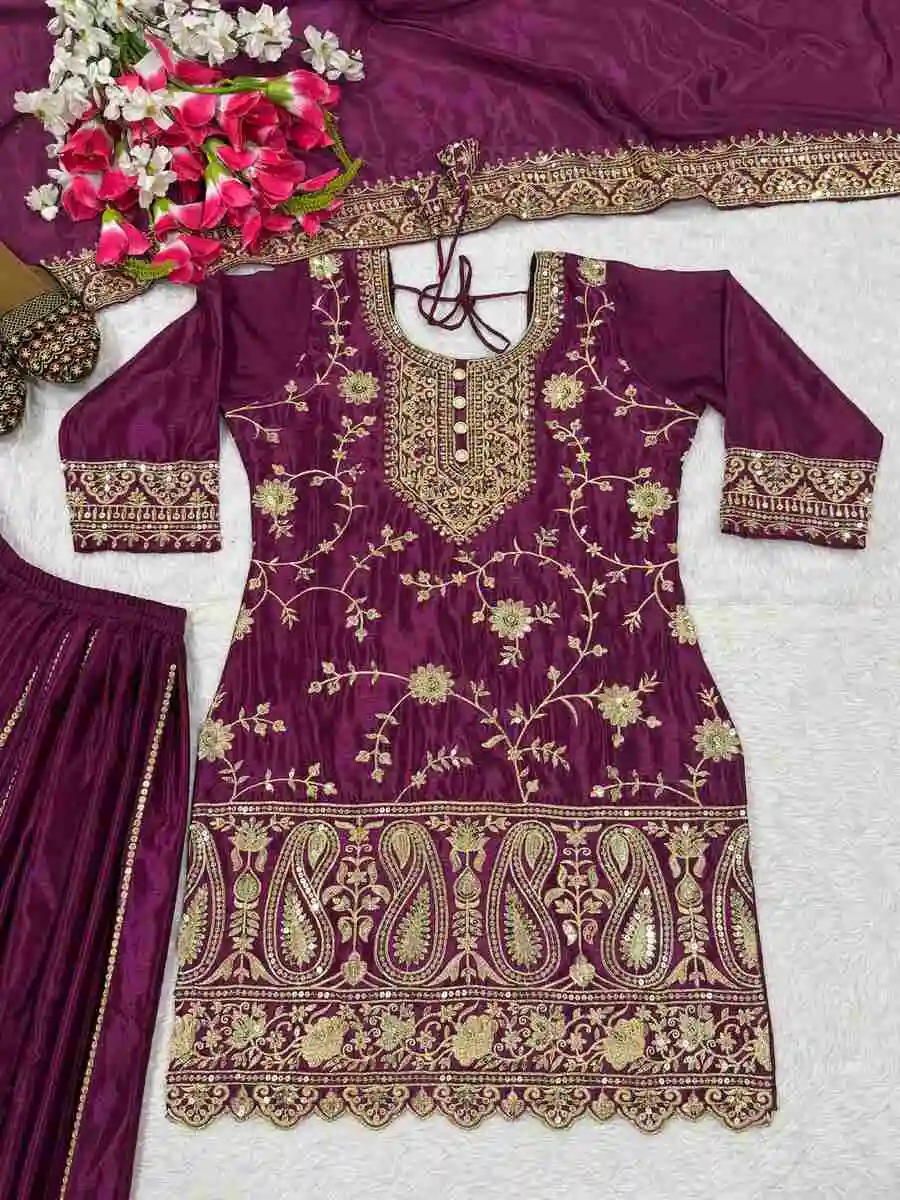 DESIGNER CHINON EMBROIDERY SEQUENCE WORK TOP PALAZZO WITH DUPATTA WINE