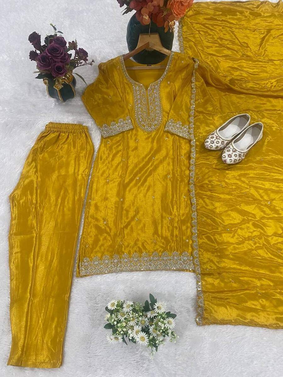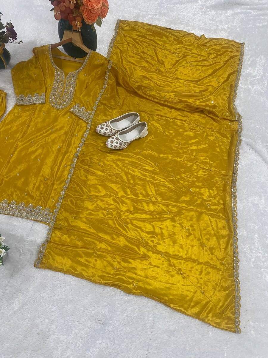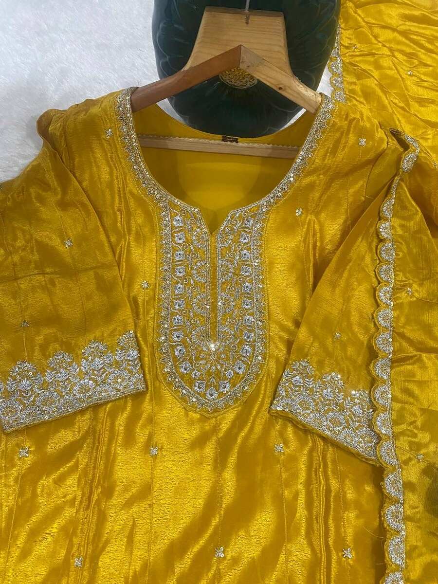 DESIGNER CHINON EMBROIDERY THREAD SEQUENCE WORK TOP BOTTOM WITH DUPATTA YELLOW
