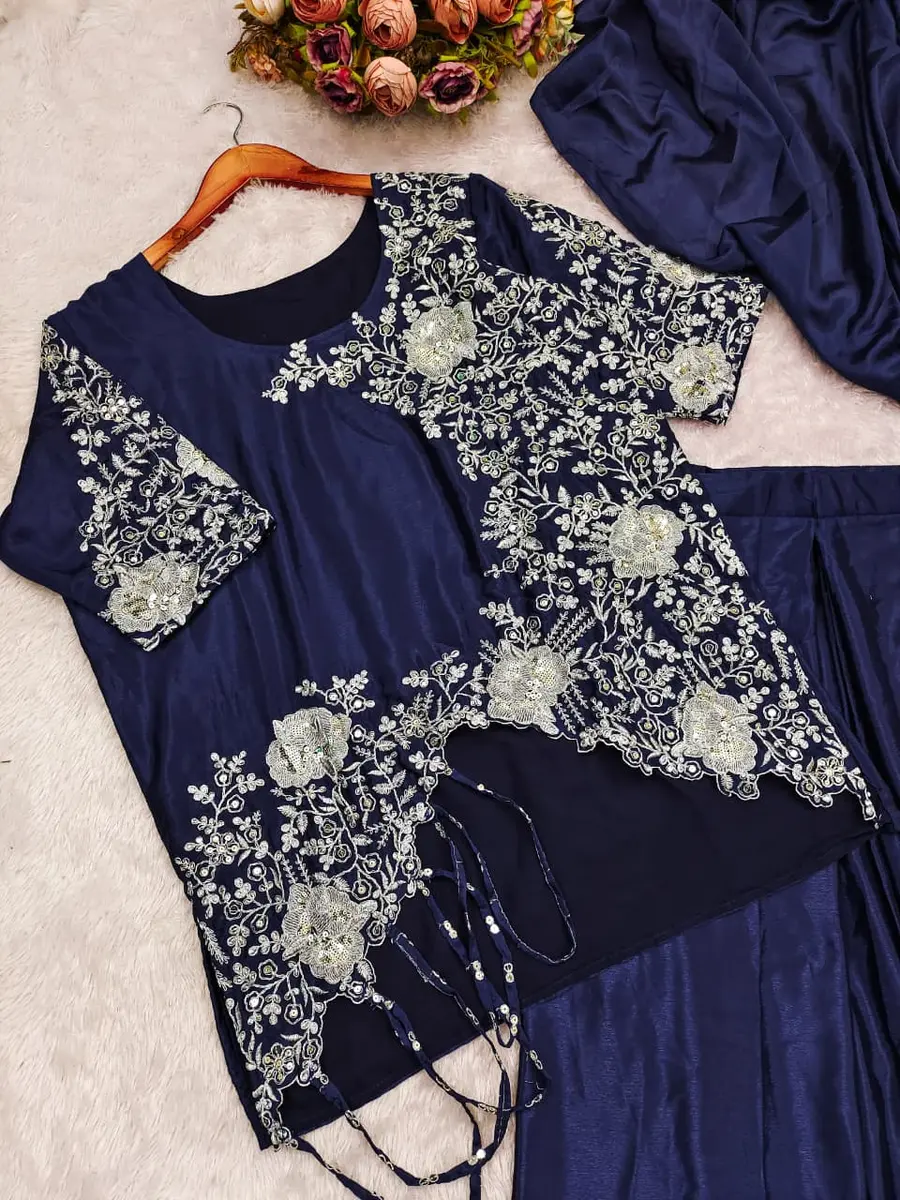 DESIGNER CHINON LACE BORDER WORK READY TO WEAR SAREE WITH STITCHED BLOUSE NAVY BLUE