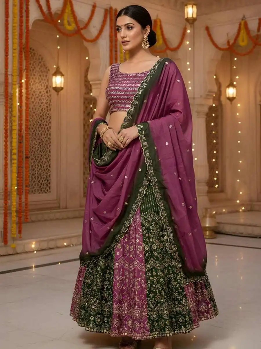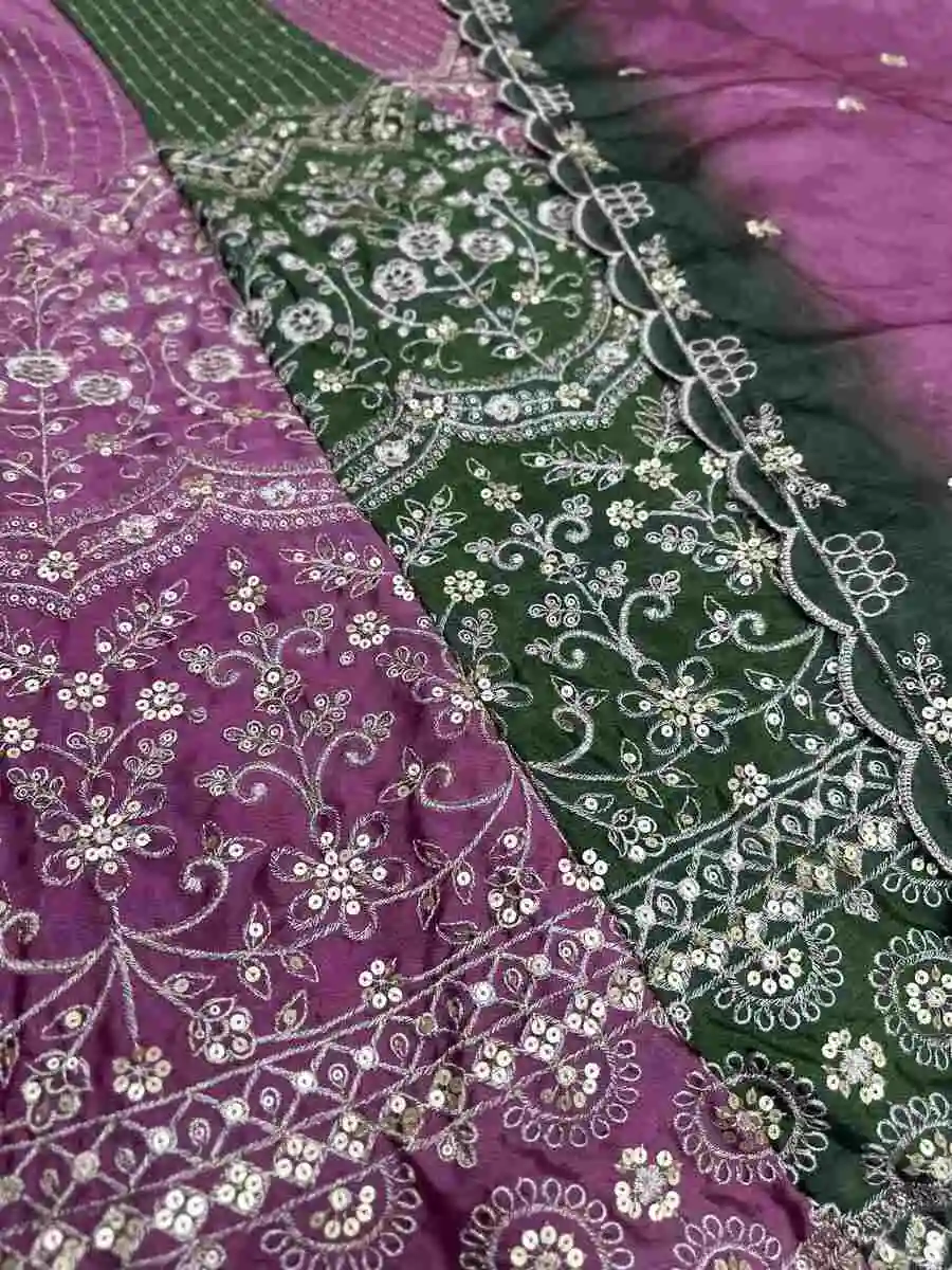 DESIGNER CHINON SEQUENCE EMBROIDERY WORK LEHENGA CHOLI WITH DUPATTA PINK AND GREEN