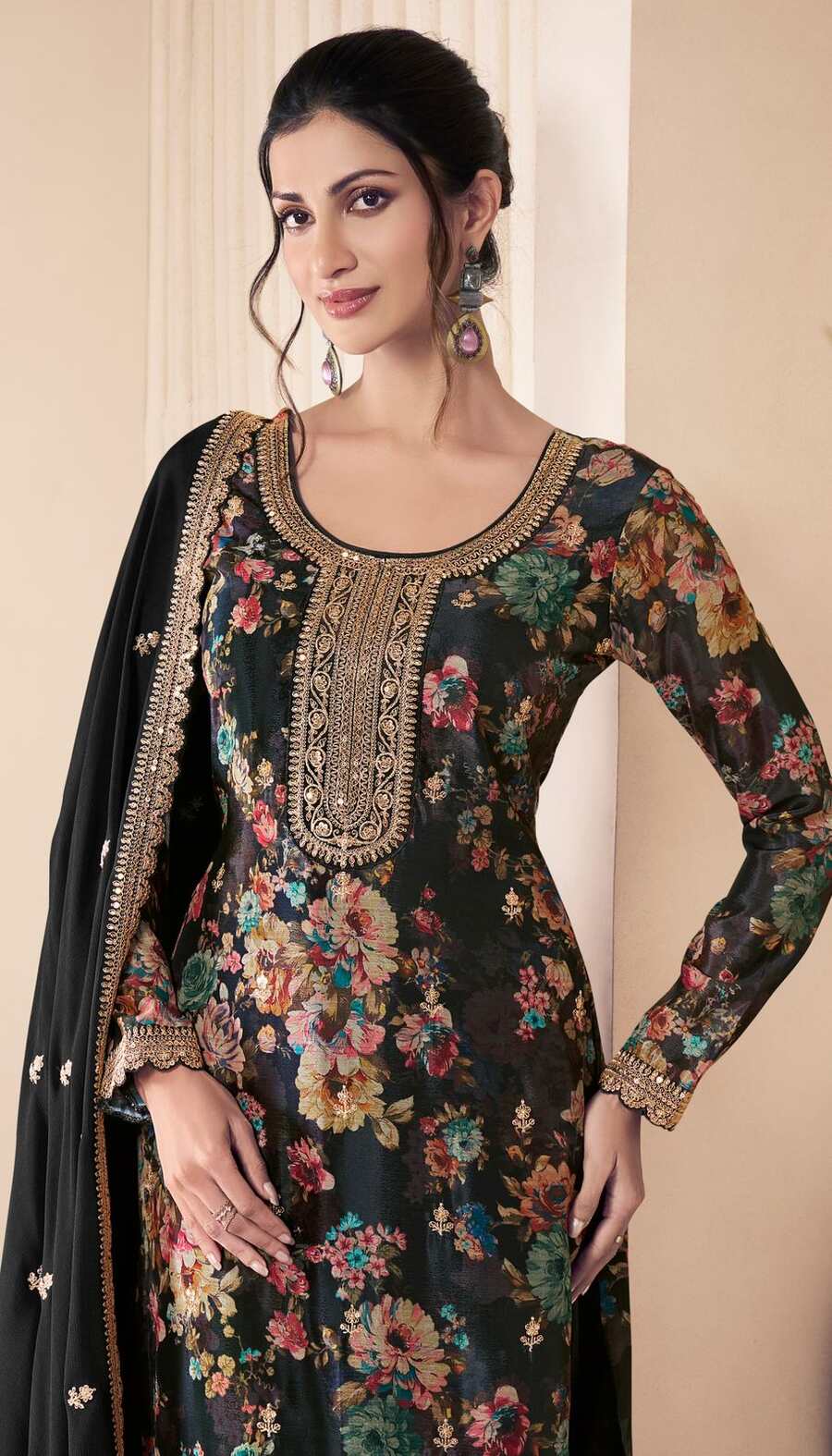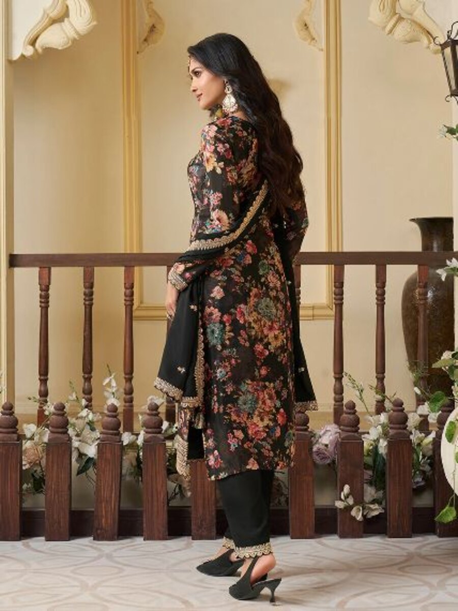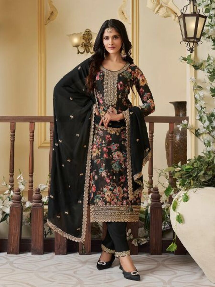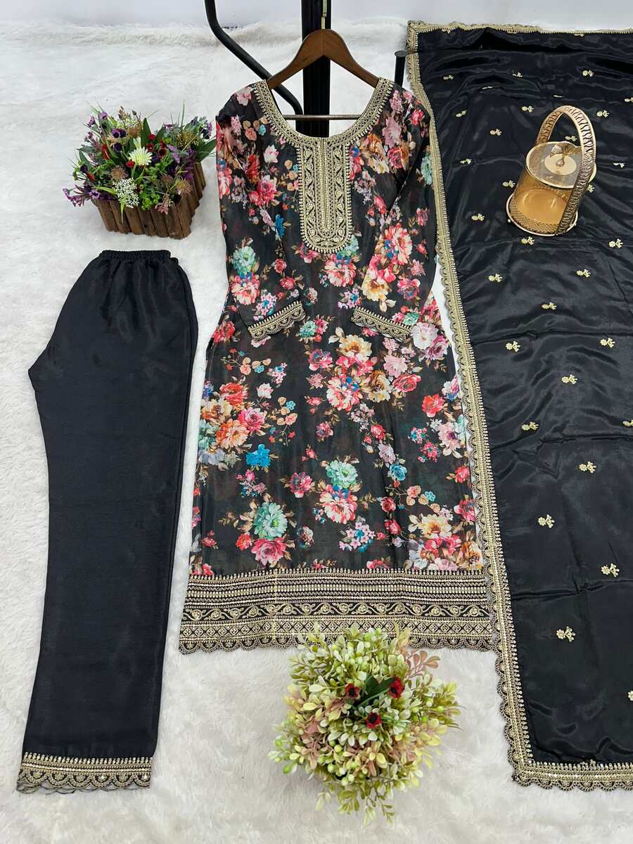 DESIGNER CHINON SILK DIGITAL PRINT WITH EMBROIDERY SEQUENCE CODING WORK TOP BOTTOM WITH DUPATTA BLACK