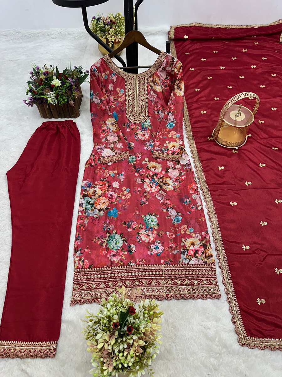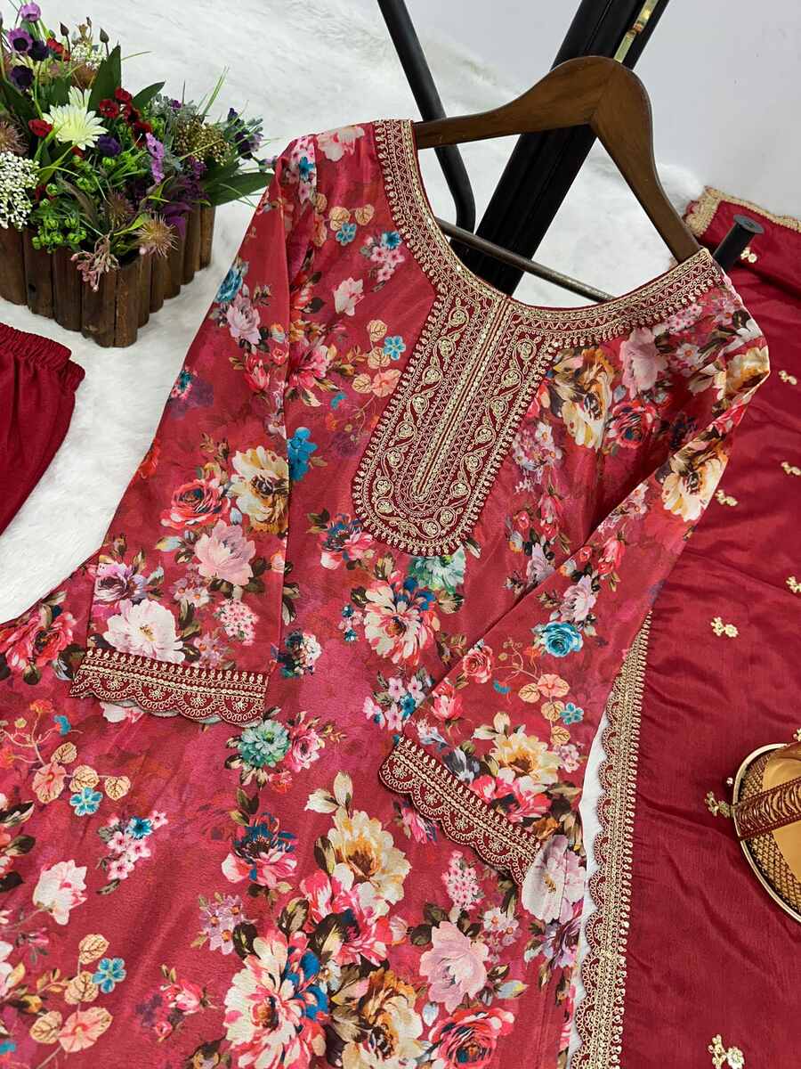 DESIGNER CHINON SILK DIGITAL PRINT WITH EMBROIDERY SEQUENCE CODING WORK TOP BOTTOM WITH DUPATTA RED