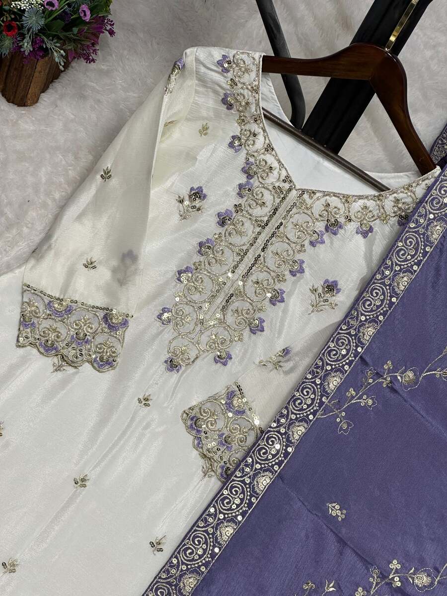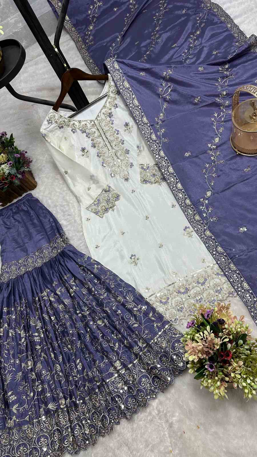 DESIGNER CHINON SILK EMBROIDERY AND SEQUENCE WITH STONE HAND WORK TOP SHARARA WITH DUPATTA LAVENDER