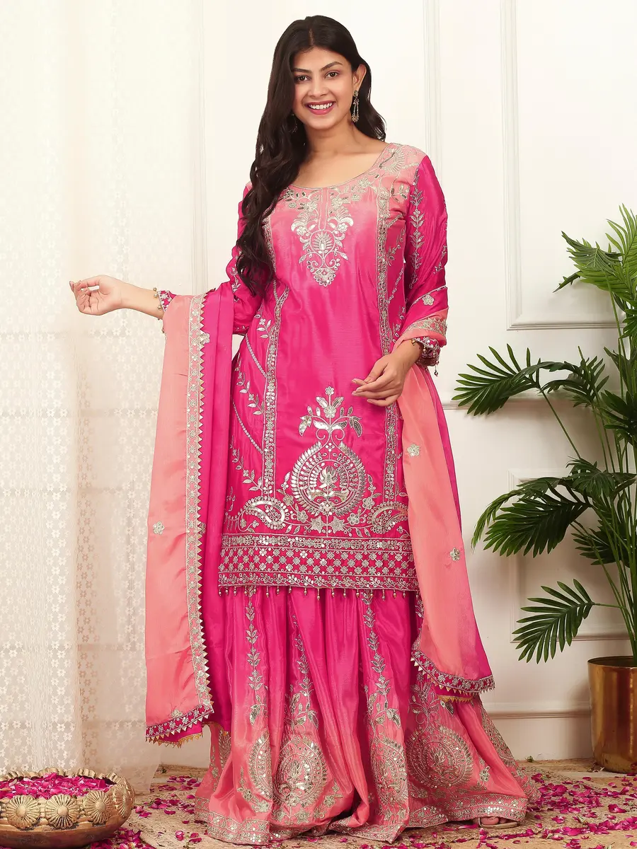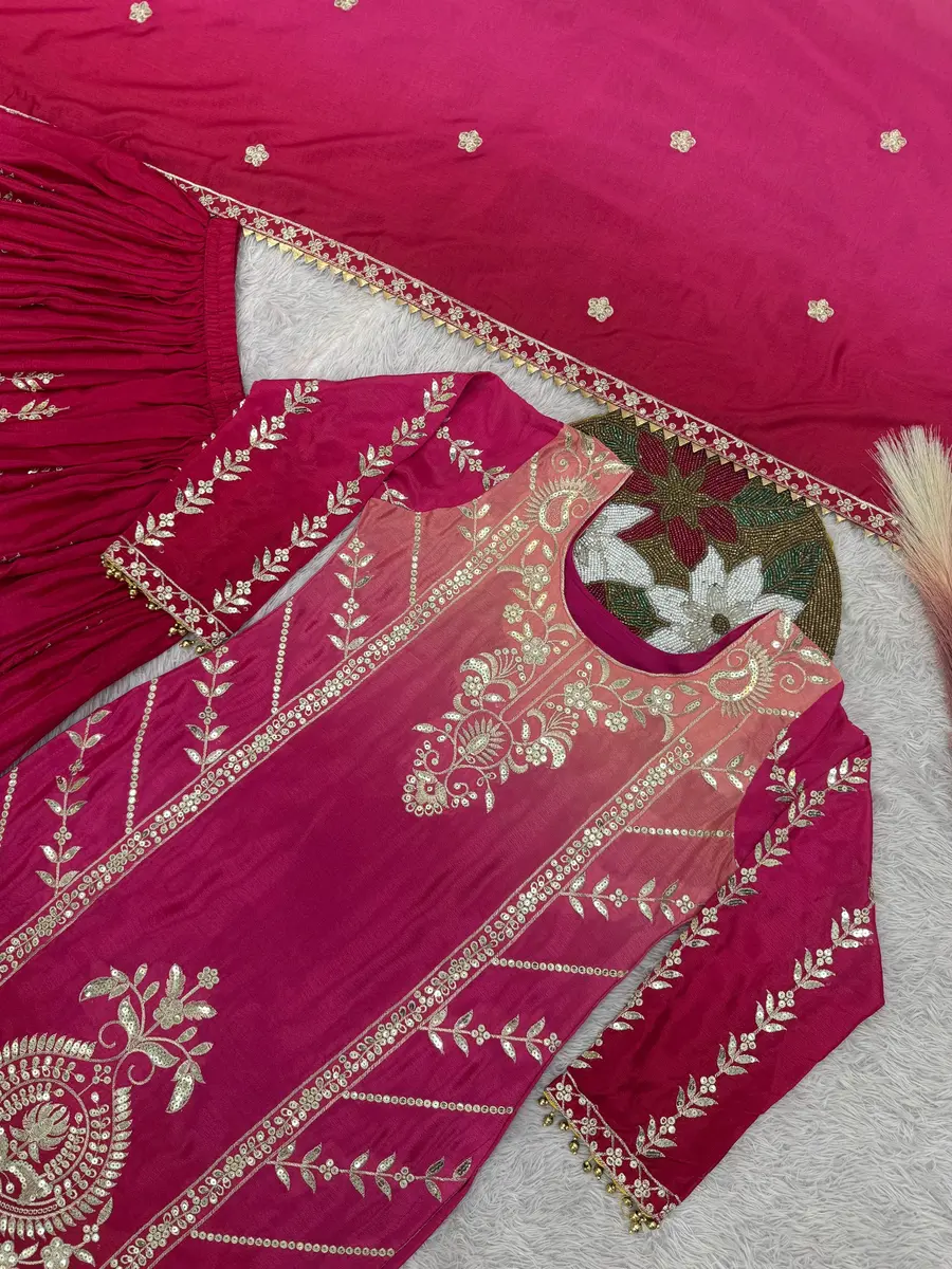 DESIGNER CHINON SILK EMBROIDERY AND SEQUENCE WORK AND HANGINGS LACE BORDER WORK TOP PALAZZO WITH DUPATTA PINK