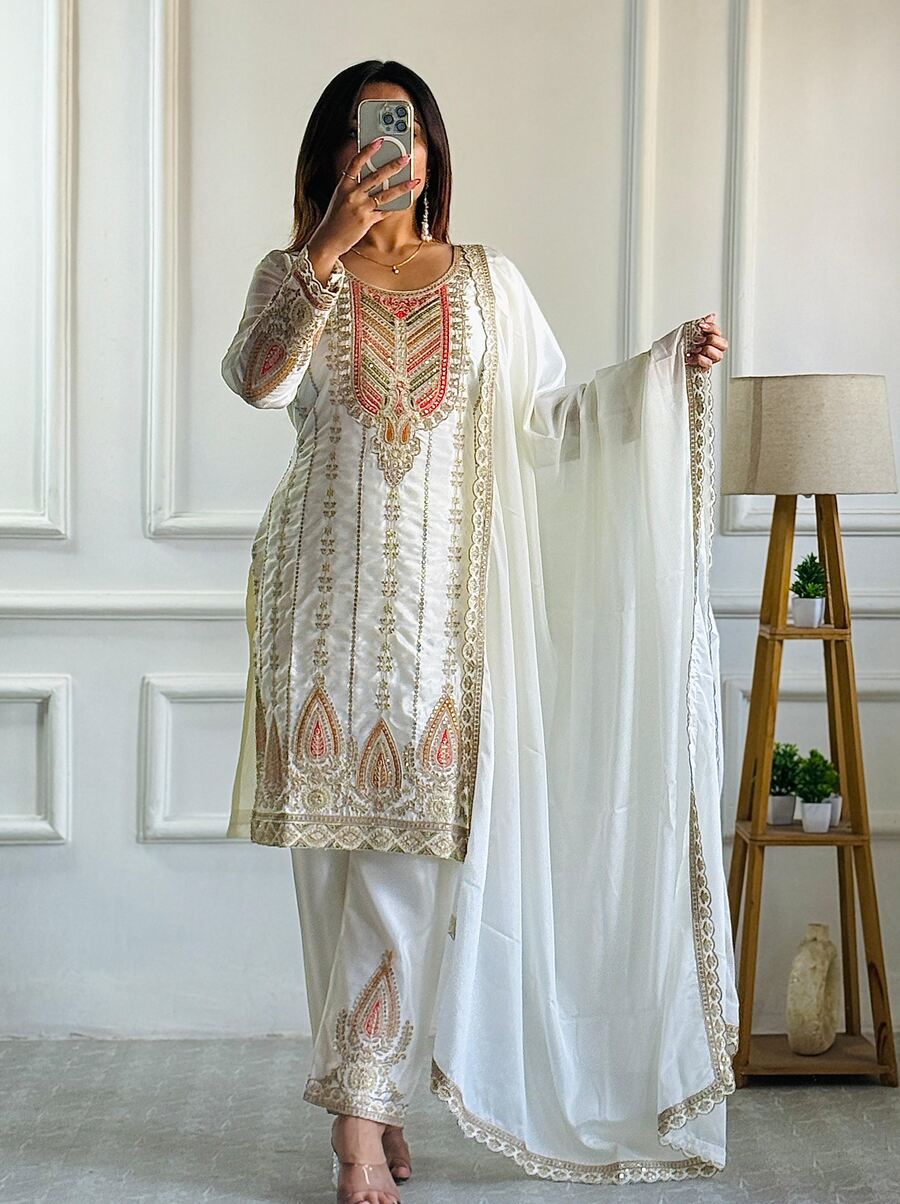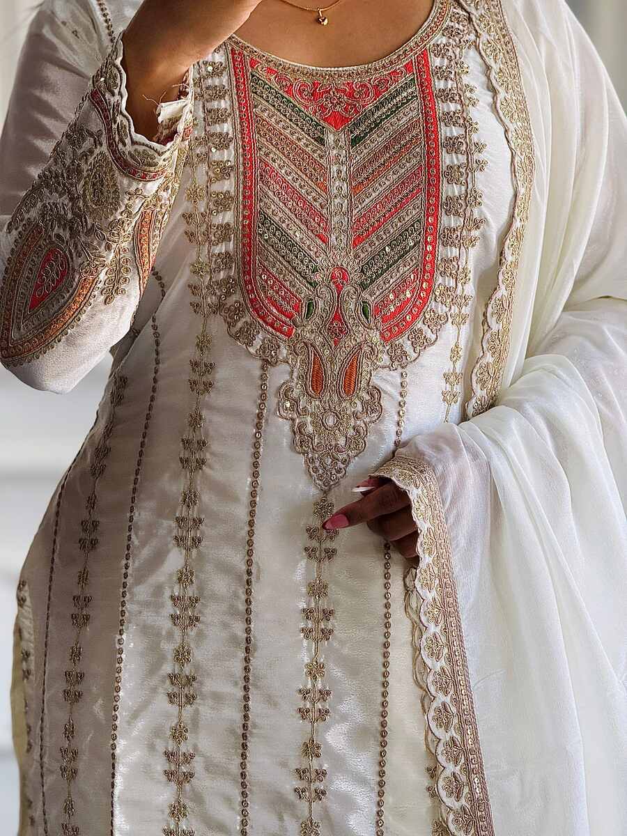 DESIGNER CHINON SILK EMBROIDERY CODING DORI SEQUENCE WORK TOP BOTTOM WITH DUPATTA WHITE