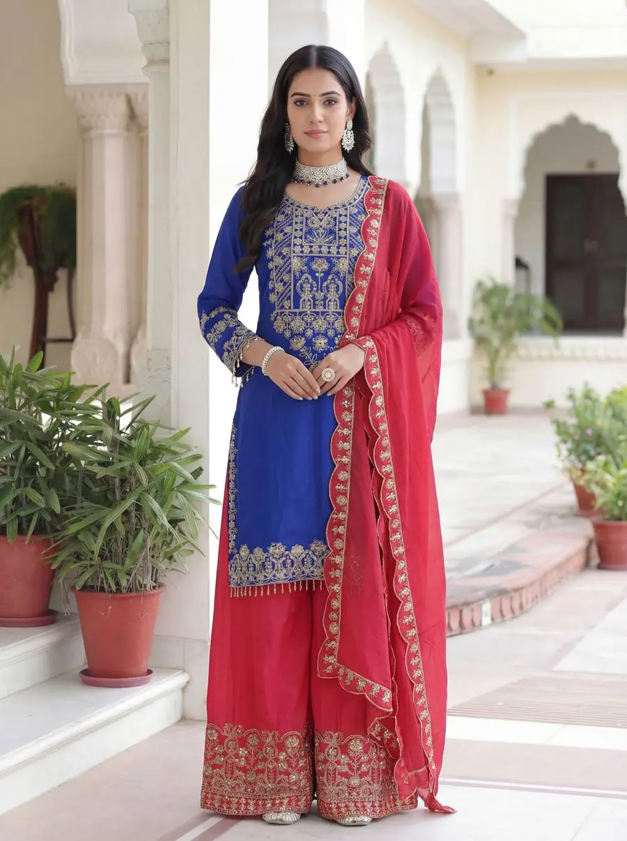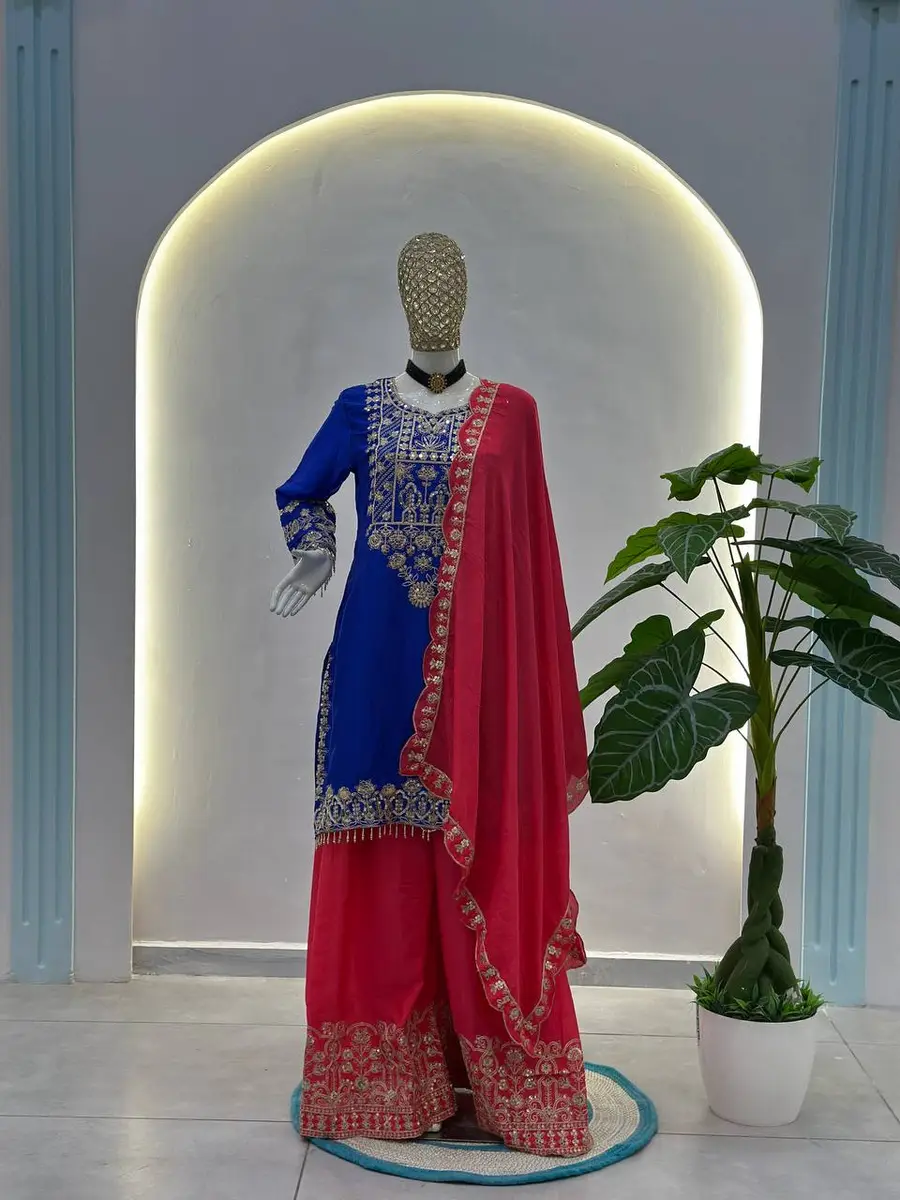 DESIGNER CHINON SILK EMBROIDERY CODING SEQUENCE WORK TOP PALAZZO WITH DUPATTA RANI AND BLUE