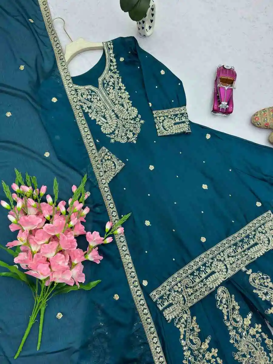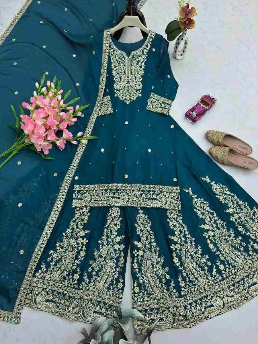 DESIGNER CHINON SILK EMBROIDERY CODING & SEQUENCE WORK TOP PALAZZO WITH DUPATTA TEAL