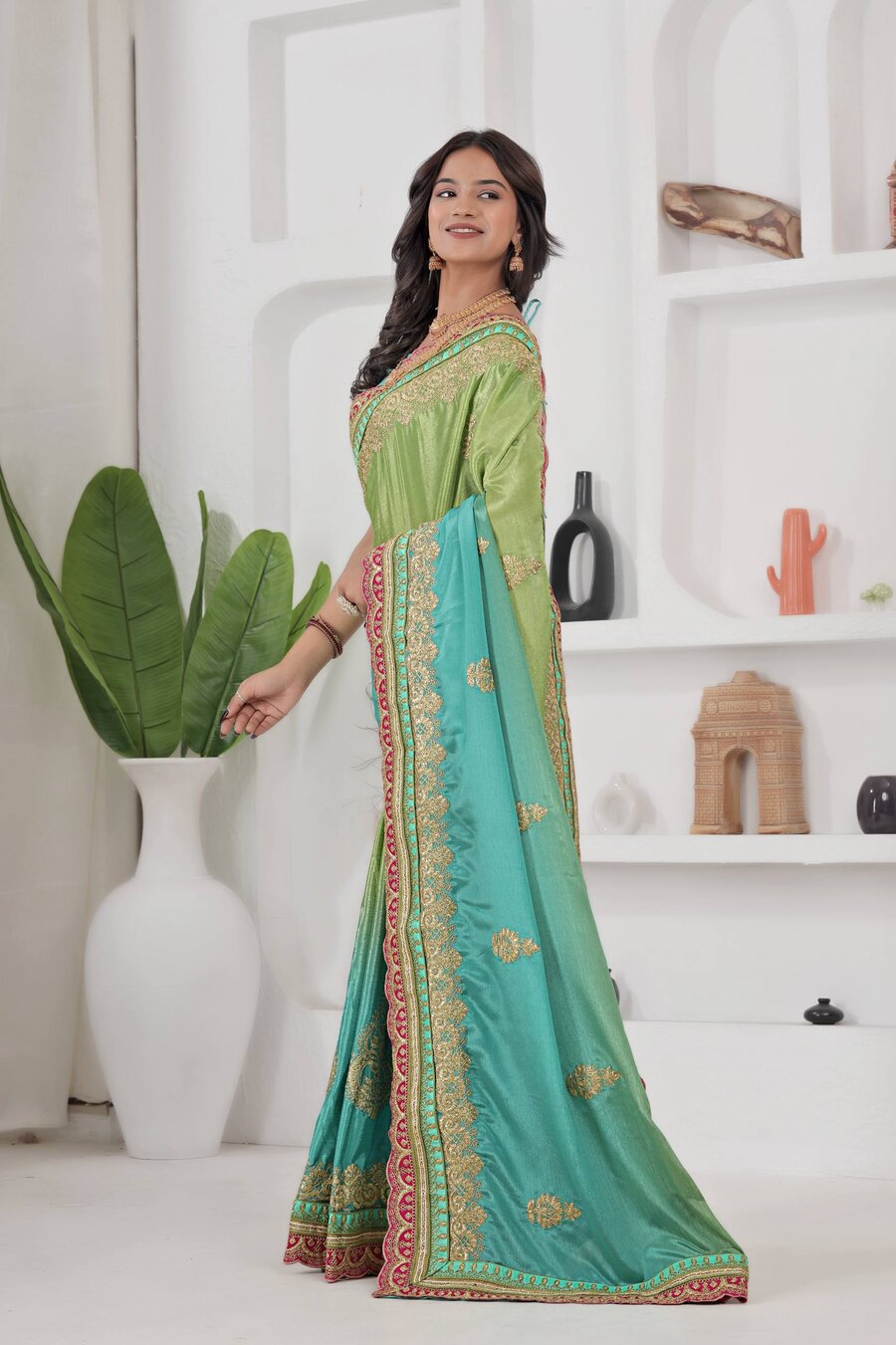 DESIGNER CHINON SILK EMBROIDERY CODING WORK SAREE WITH UNSTITCHED BLOUSE RAMA AND GREEN