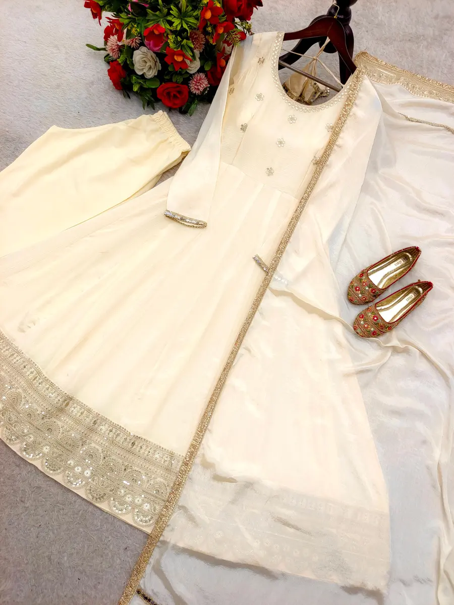 DESIGNER CHINON SILK EMBROIDERY SEQUENCE CODING DORI WORK GOWN BOTTOM WITH DUPATTA CREAM