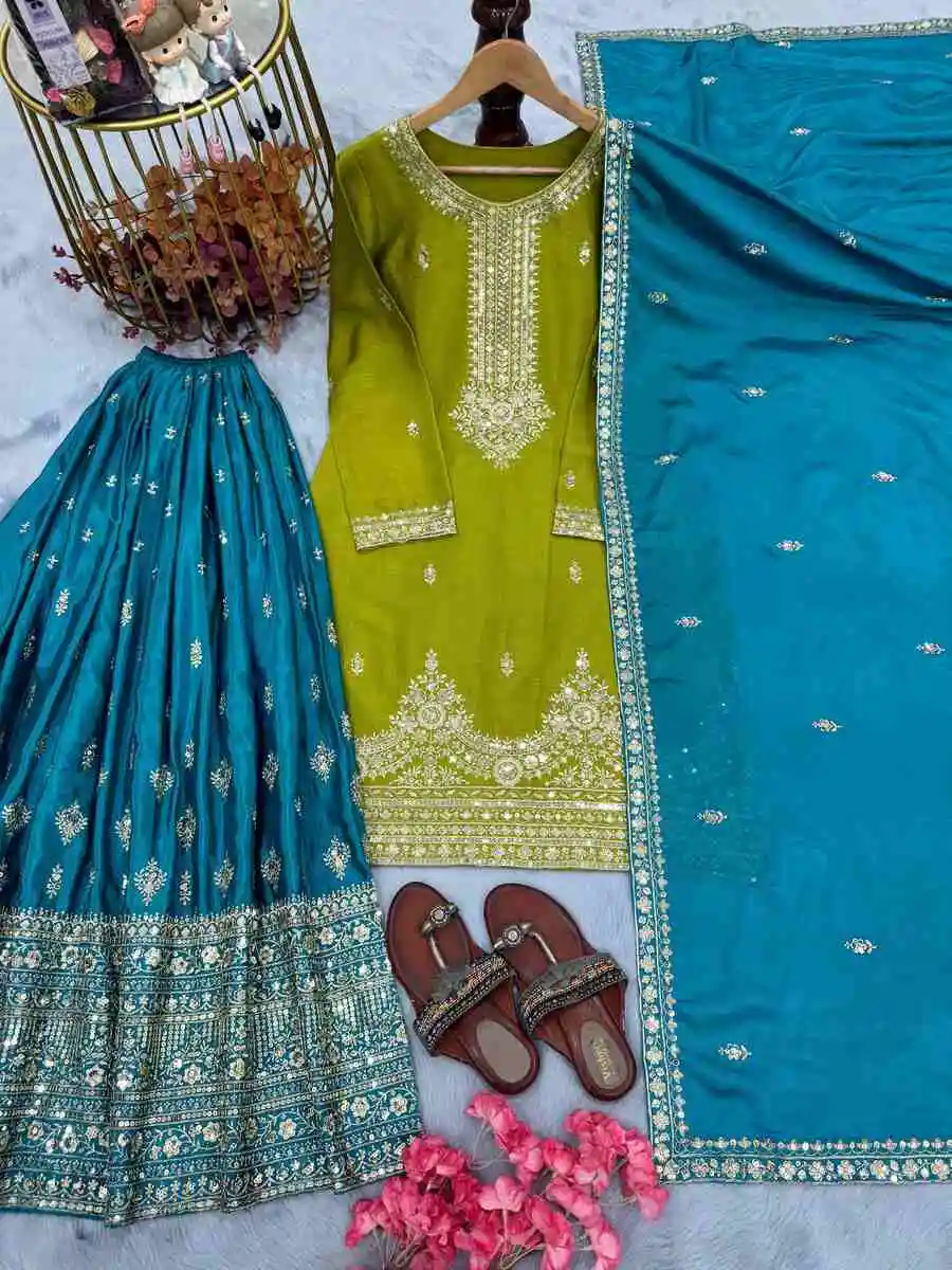 DESIGNER CHINON SILK EMBROIDERY SEQUENCE WORK TOP PALAZZO WITH DUPATTA RAMA AND PARROT GREEN