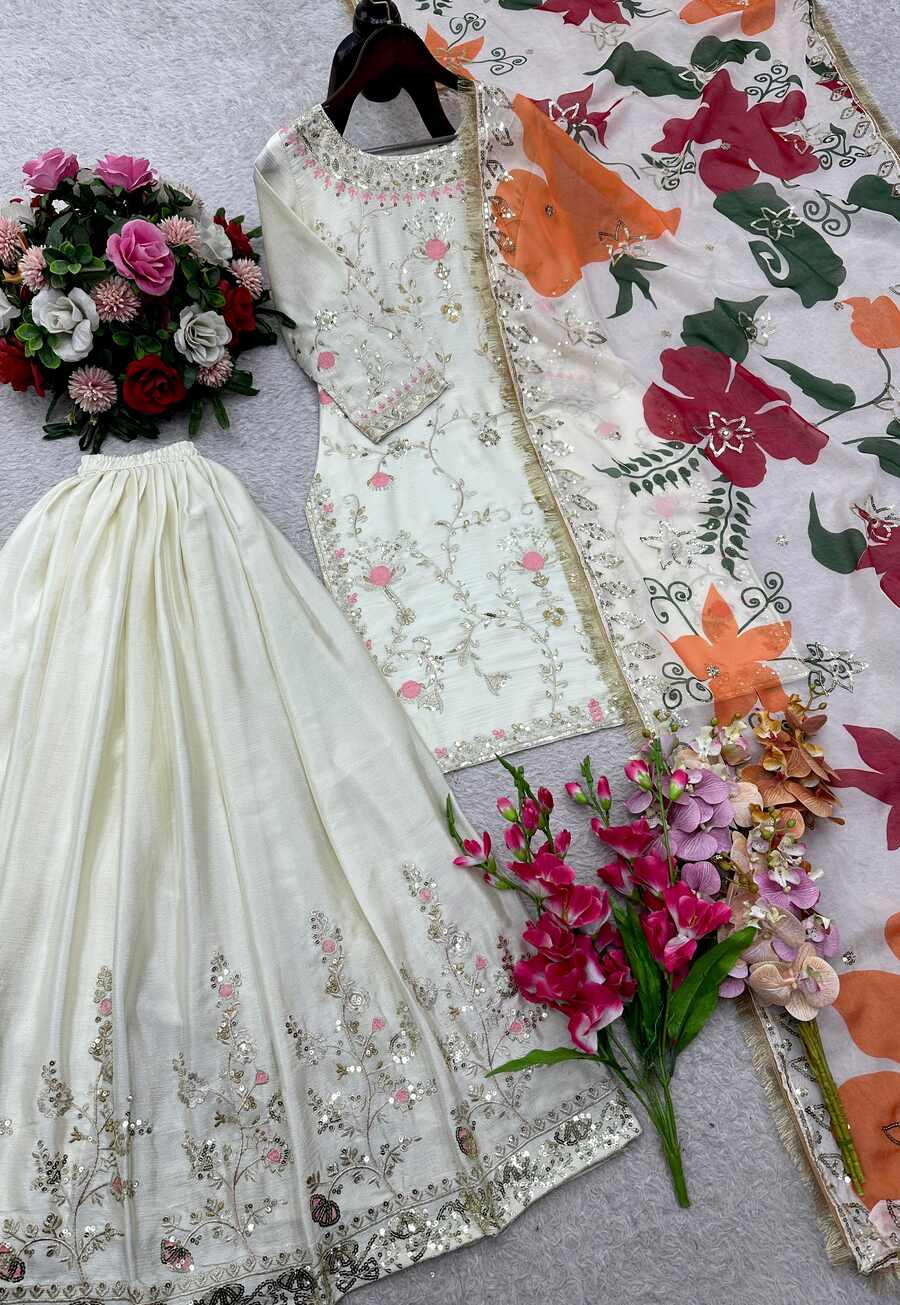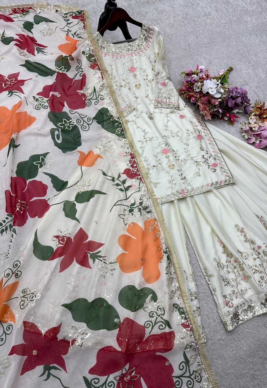 DESIGNER CHINON SILK EMBROIDERY SEQUENCE WORK TOP PALAZZO WITH DUPATTA WHITE