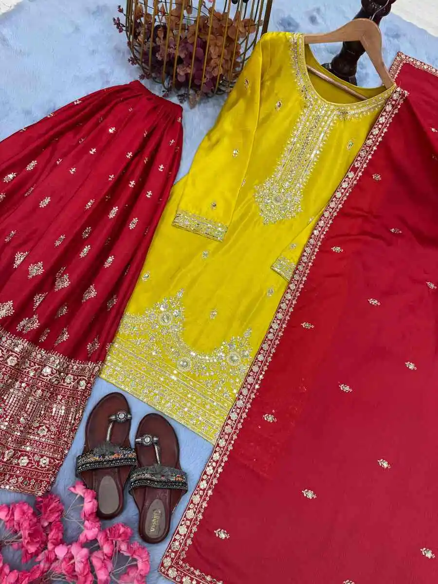 DESIGNER CHINON SILK EMBROIDERY SEQUENCE WORK TOP PALAZZO WITH DUPATTA YELLOW AND RED