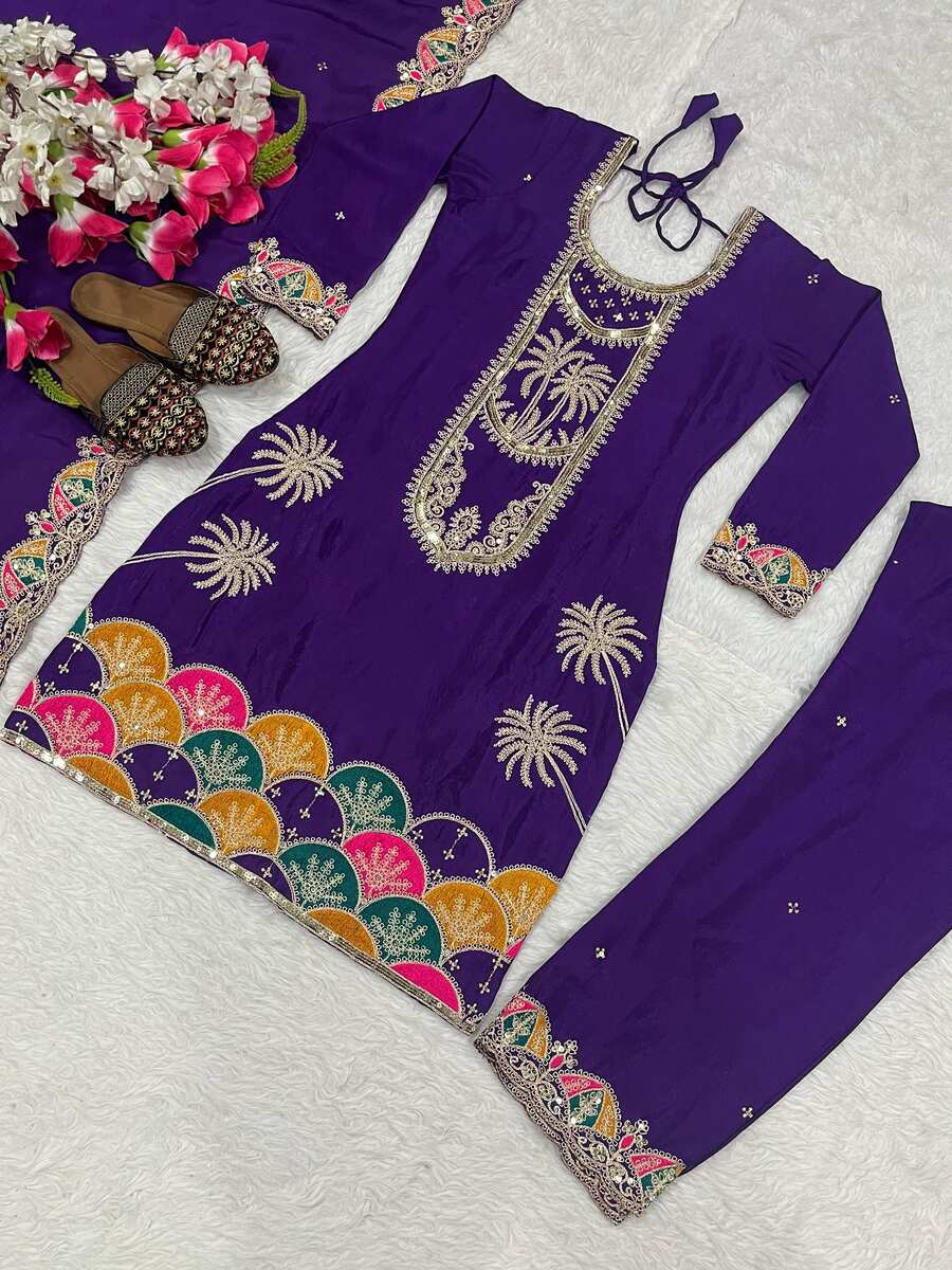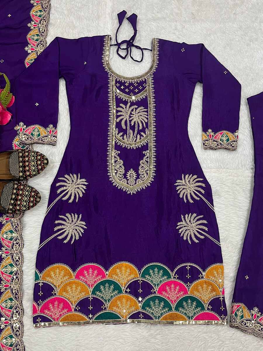 DESIGNER CHINON SILK SEQUENCE EMBROIDERY WORK TOP BOTTOM WITH DUPATTA PURPLE