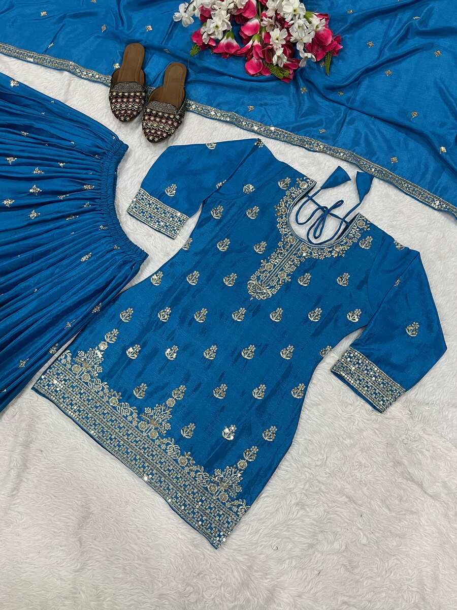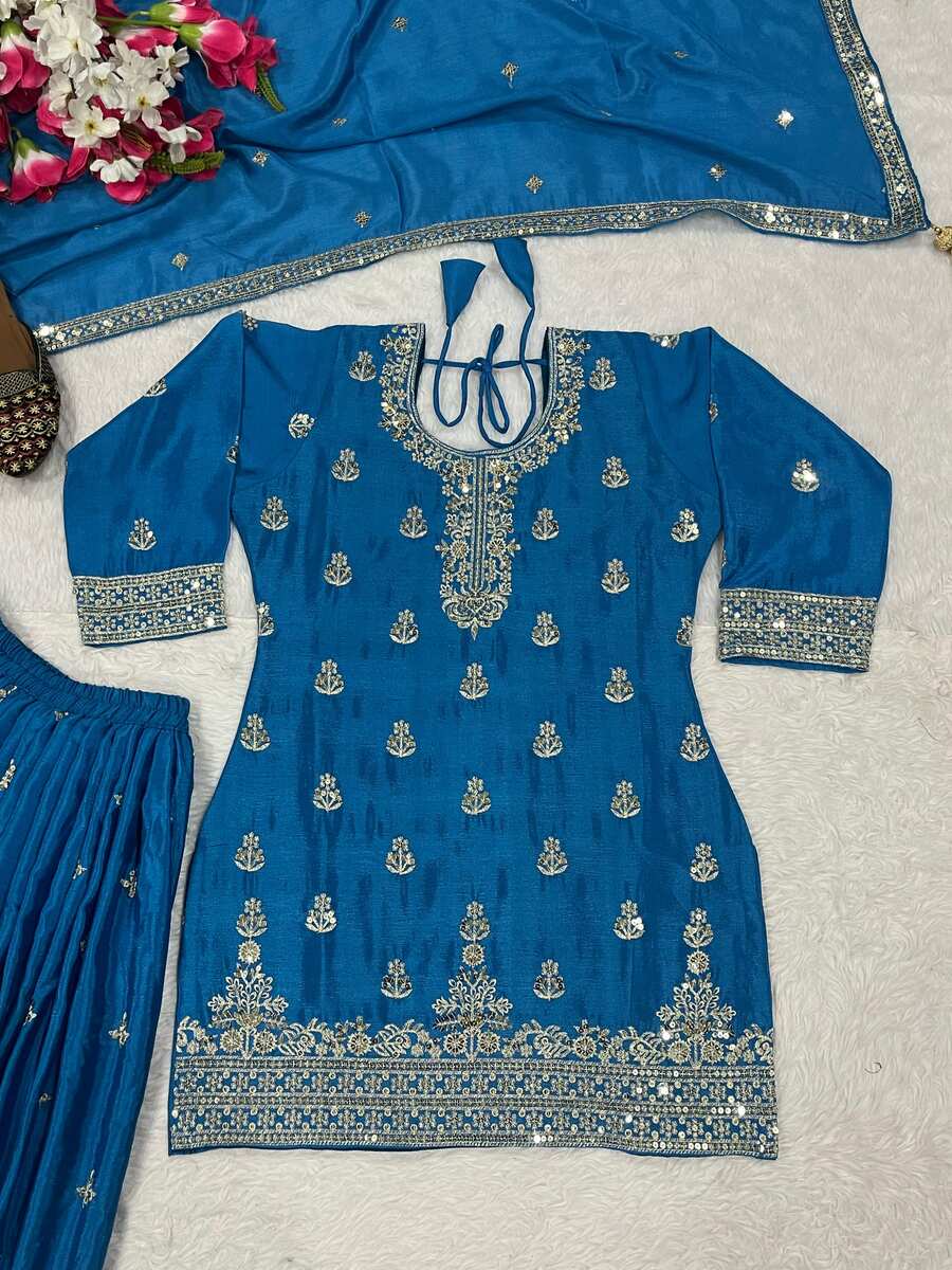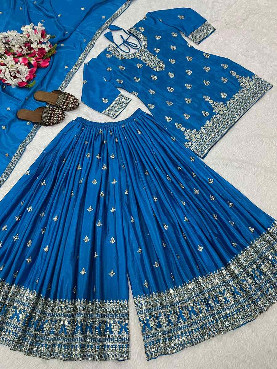 DESIGNER CHINON SILK SEQUENCE EMBROIDERY WORK TOP PALAZZO WITH DUPATTA BLUE