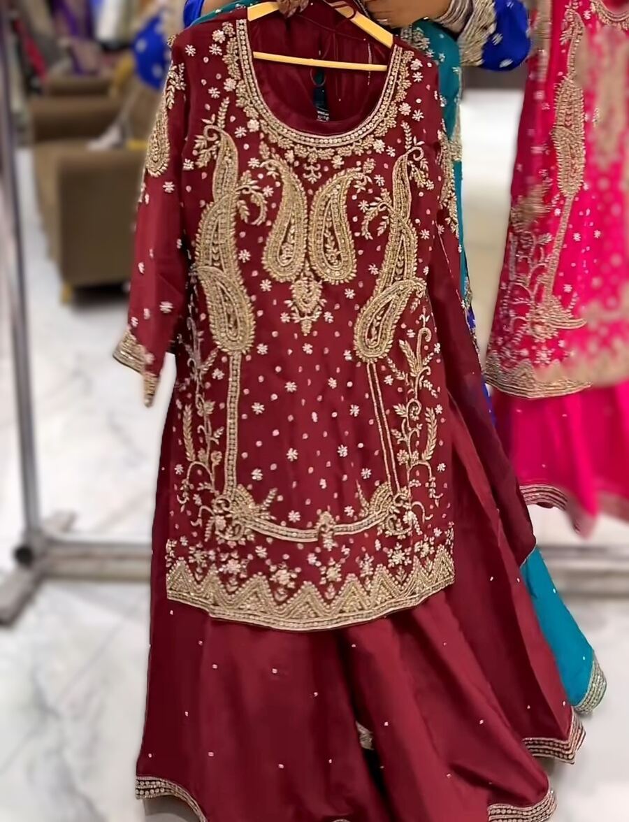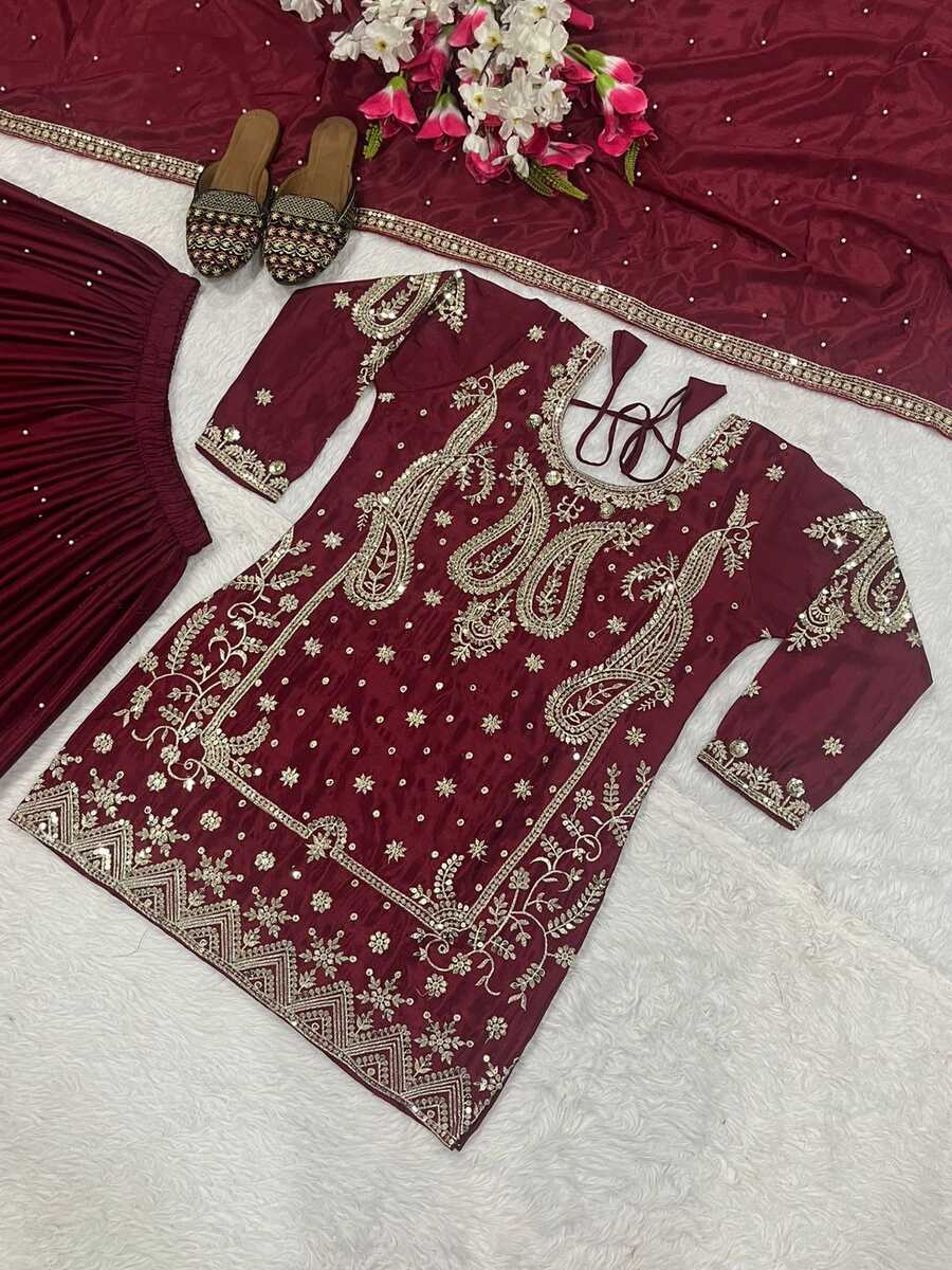 DESIGNER CHINON SILK SEQUENCE EMBROIDERY WORK TOP PALAZZO WITH DUPATTA MAROON