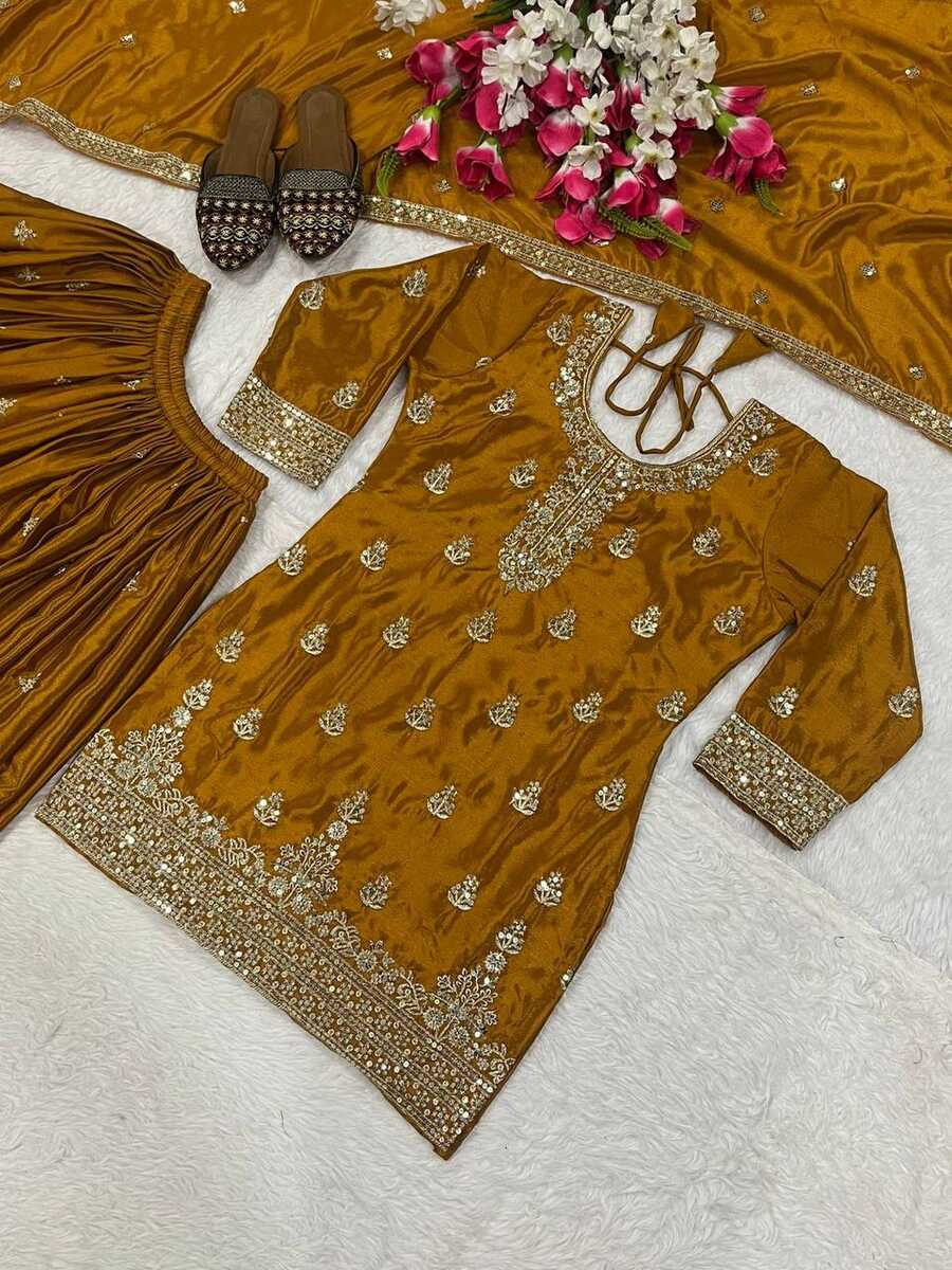 DESIGNER CHINON SILK SEQUENCE EMBROIDERY WORK TOP PALAZZO WITH DUPATTA MUSTARD