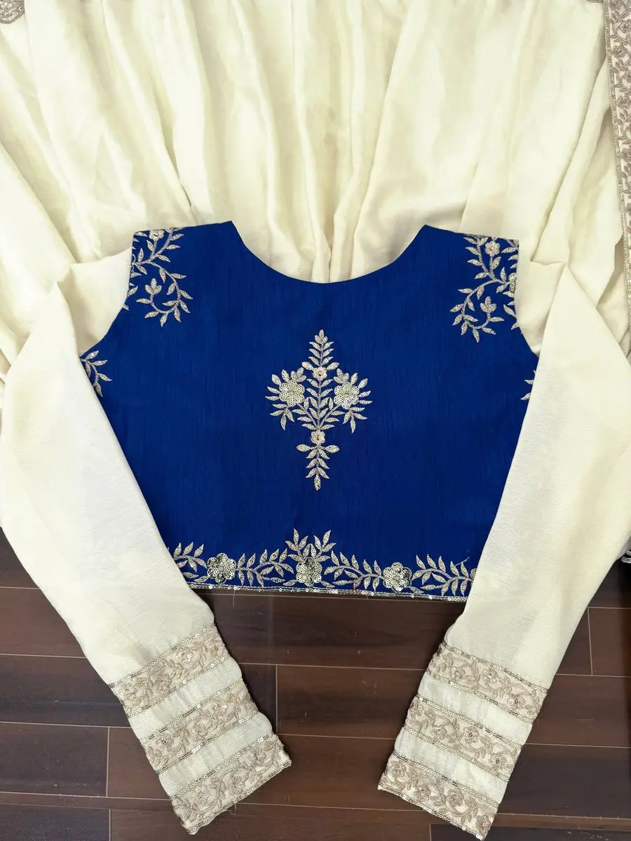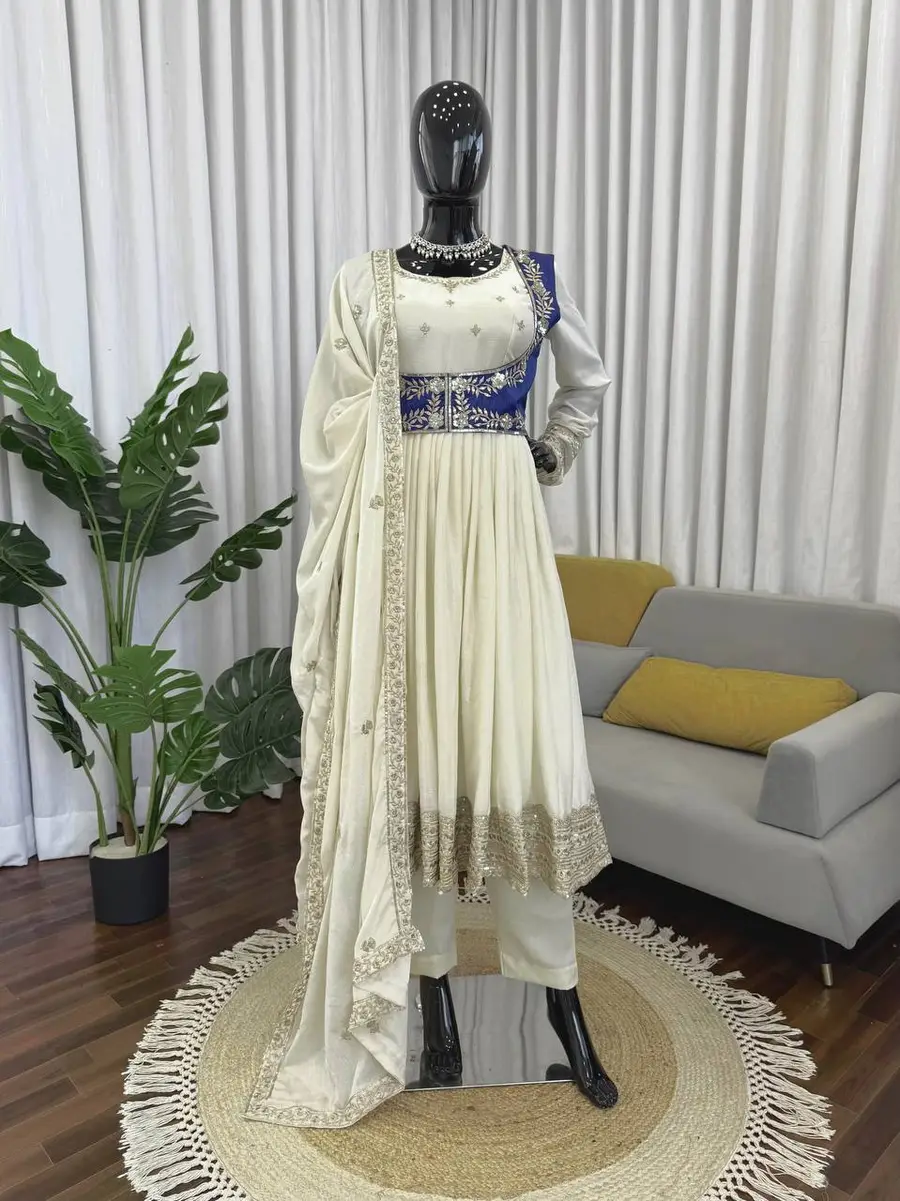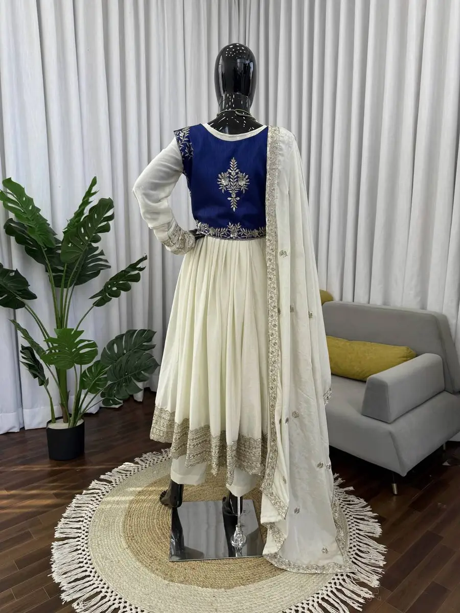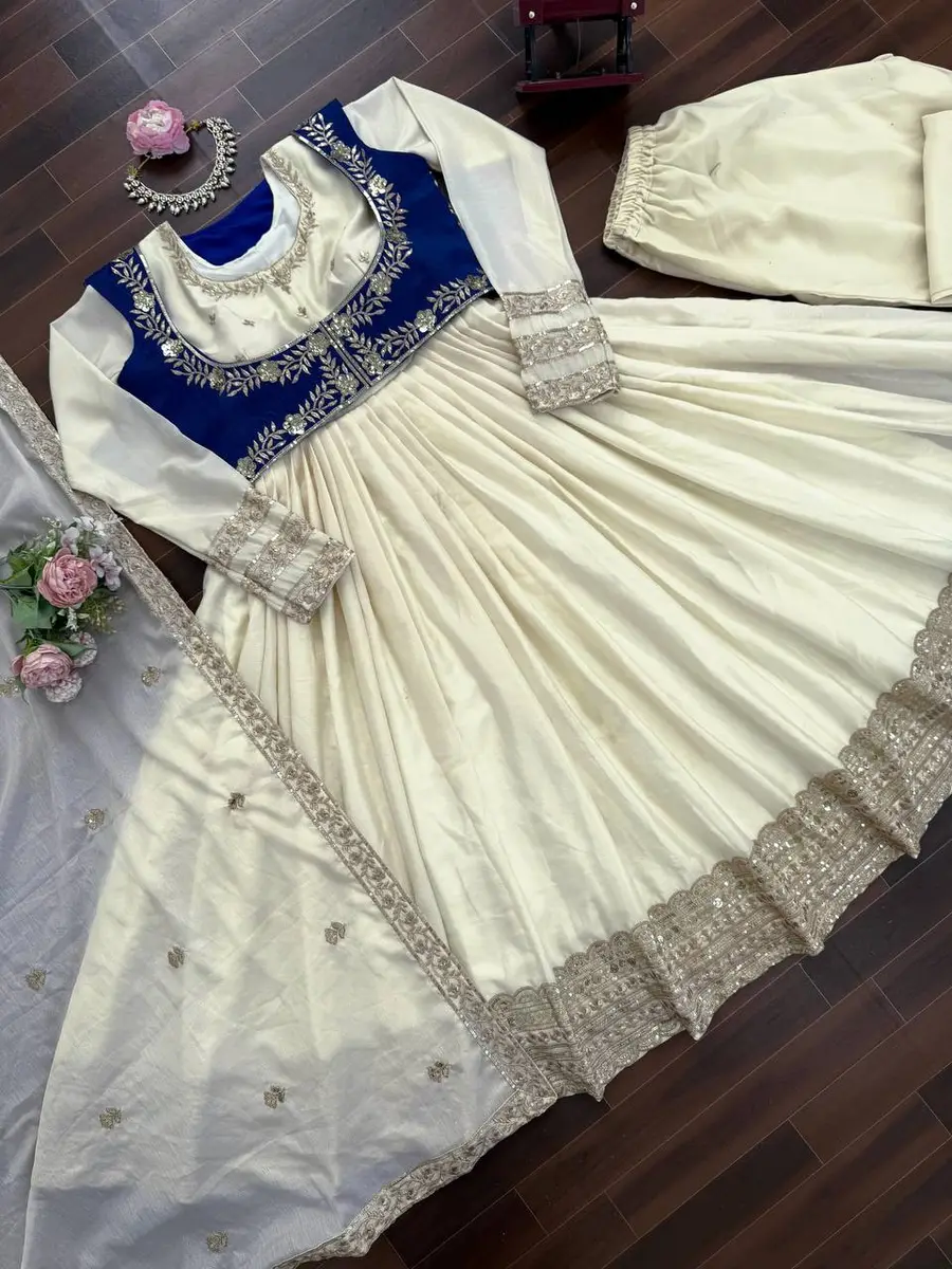 DESIGNER CHINON SILK THREAD WITH SEQUENCE WORK GOWN BOTTOM WITH DUPATTA AND KOTI OFF WHITE AND BLUE