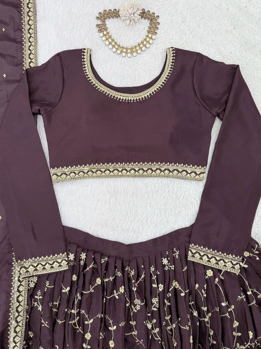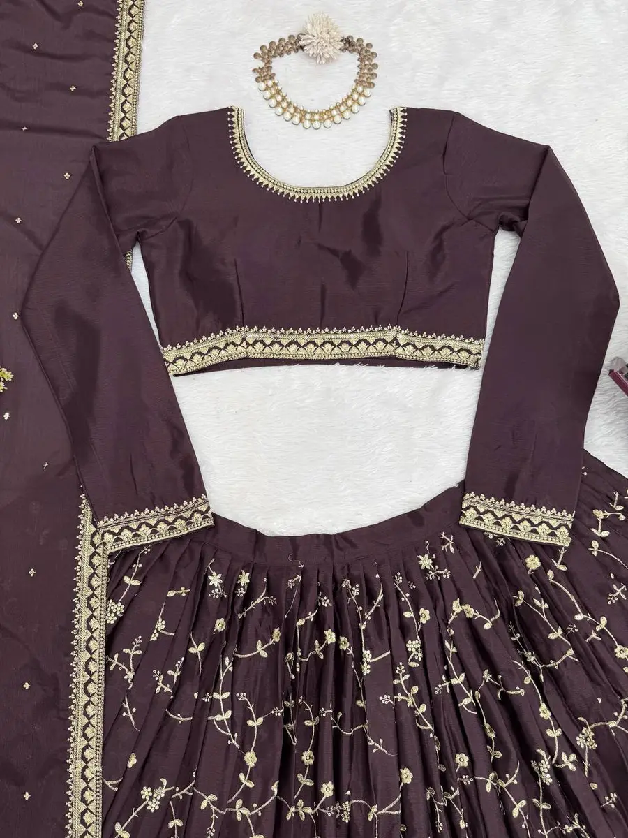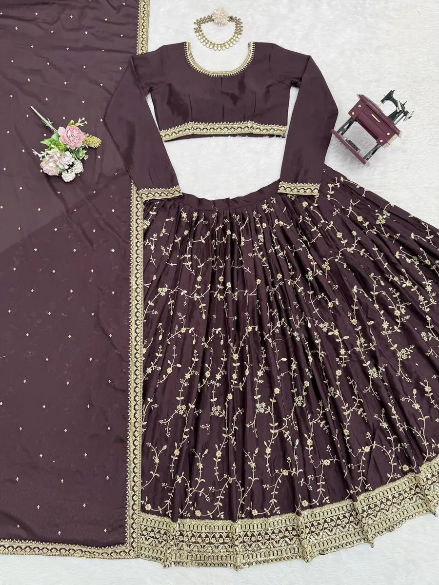 DESIGNER CHINON SILK THREAD WITH SEQUENCE WORK LEHENGA CHOLI WITH DUPATTA BROWN