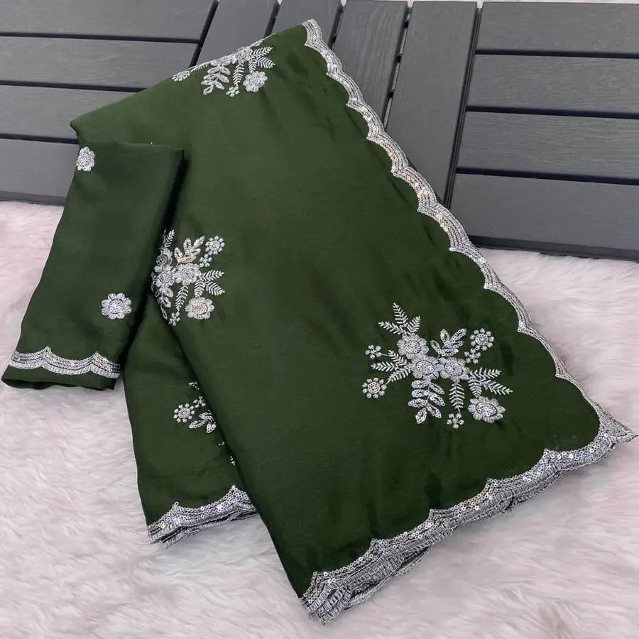 DESIGNER CHINON WHITE SILVER ZARI EMBROIDERY WORK SAREE WITH UNSTITCHED BLOUSE MEHNDI