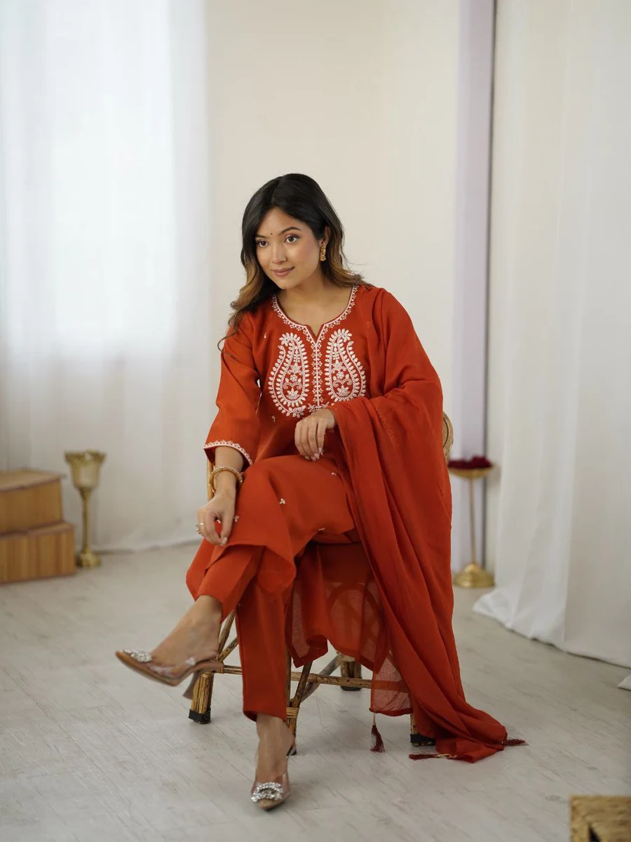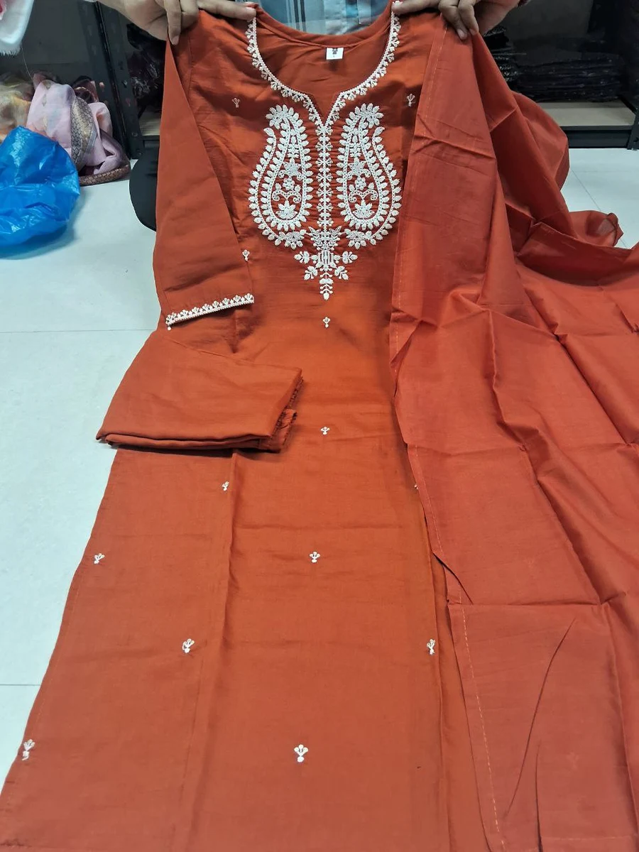 DESIGNER CHNADERI SILK EMBROIDERY SEQUENCE WORK TOP BOTTOM WITH DUPATTA ORANGE