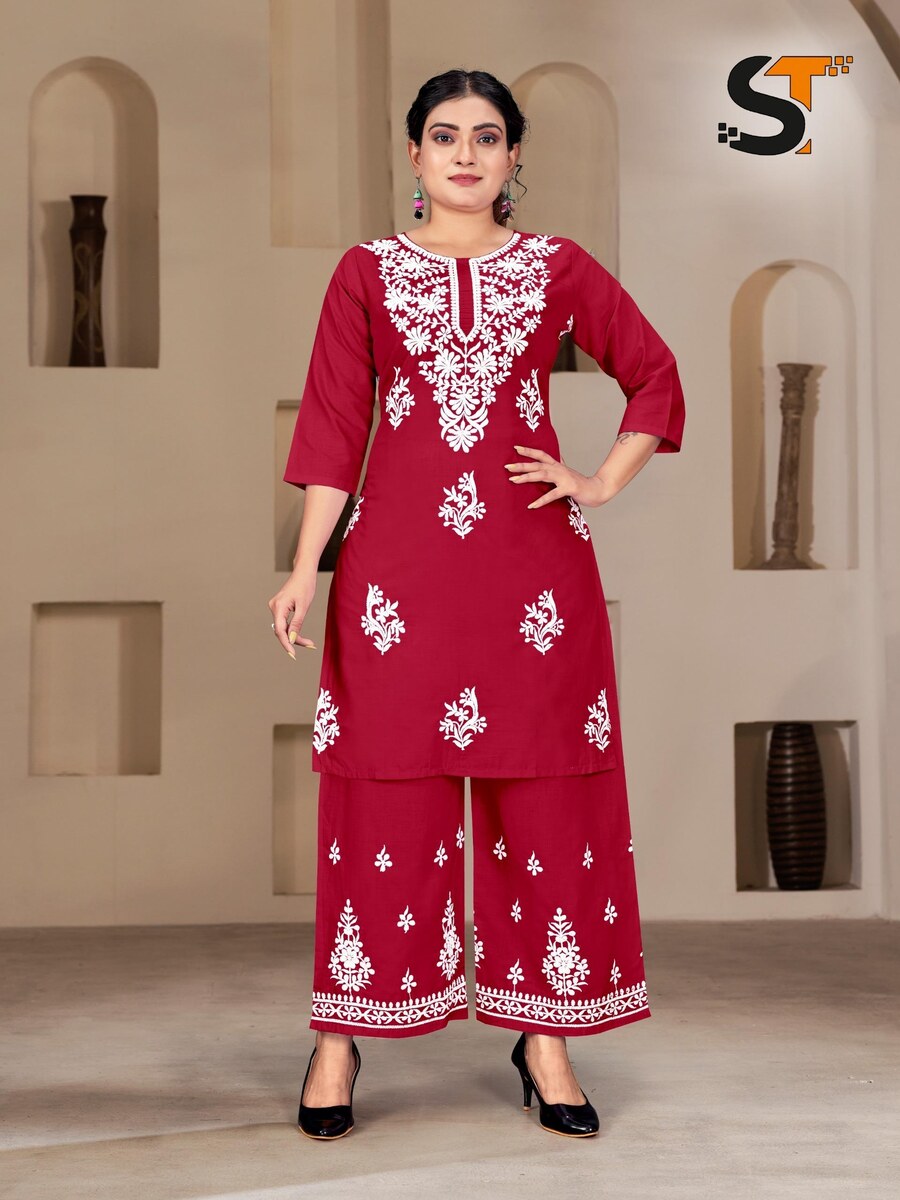 DESIGNER COTTON CHICENKARI EMBROIDERY WORK TOP PALAZZO MAROON