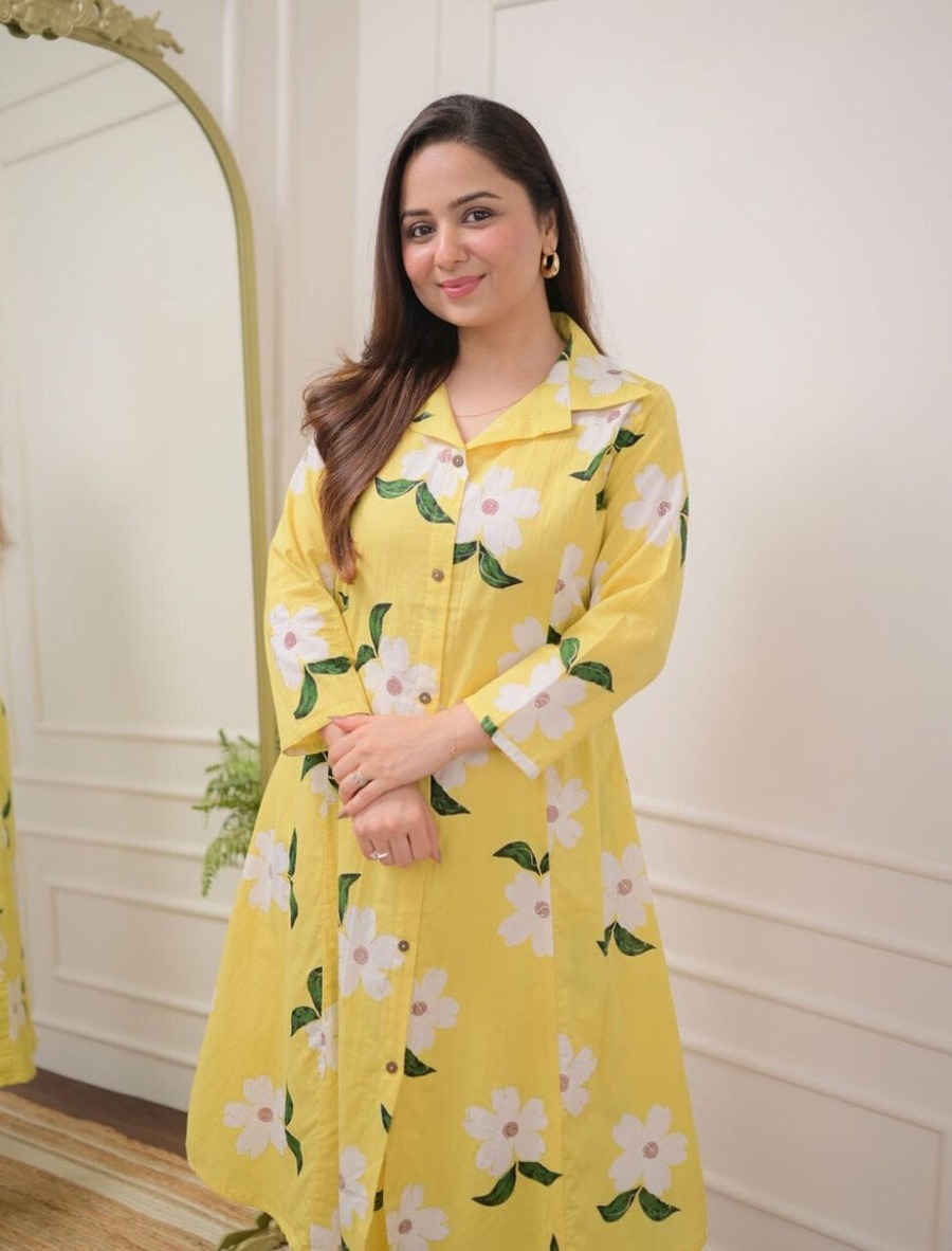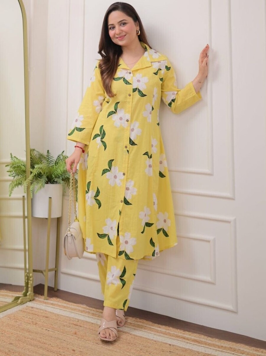 DESIGNER COTTON DIGITAL PRINTED WORK TOP PENT SET YELLOW