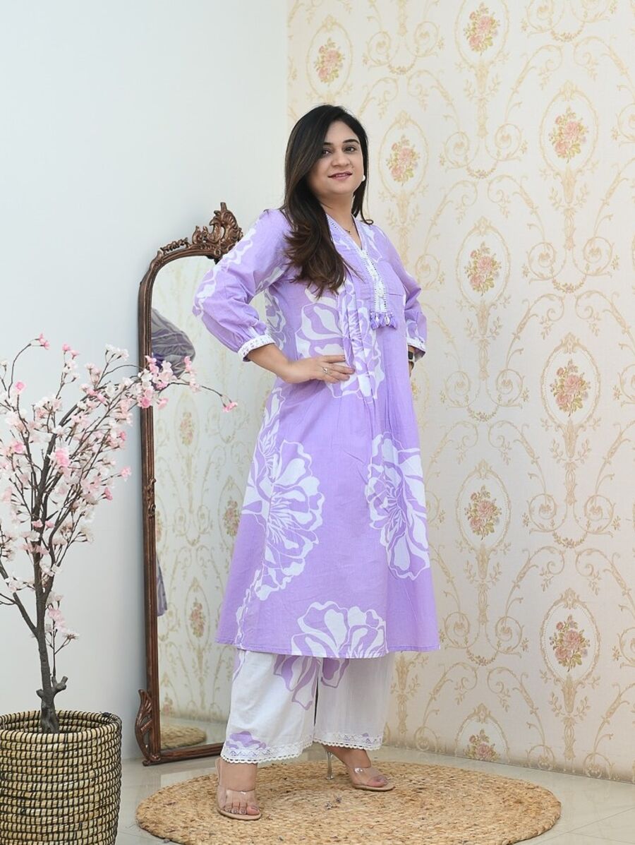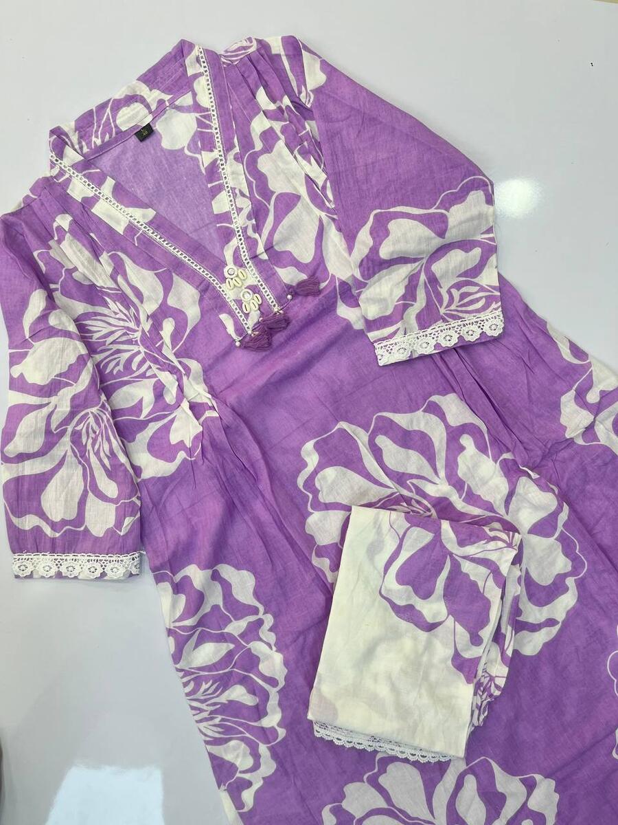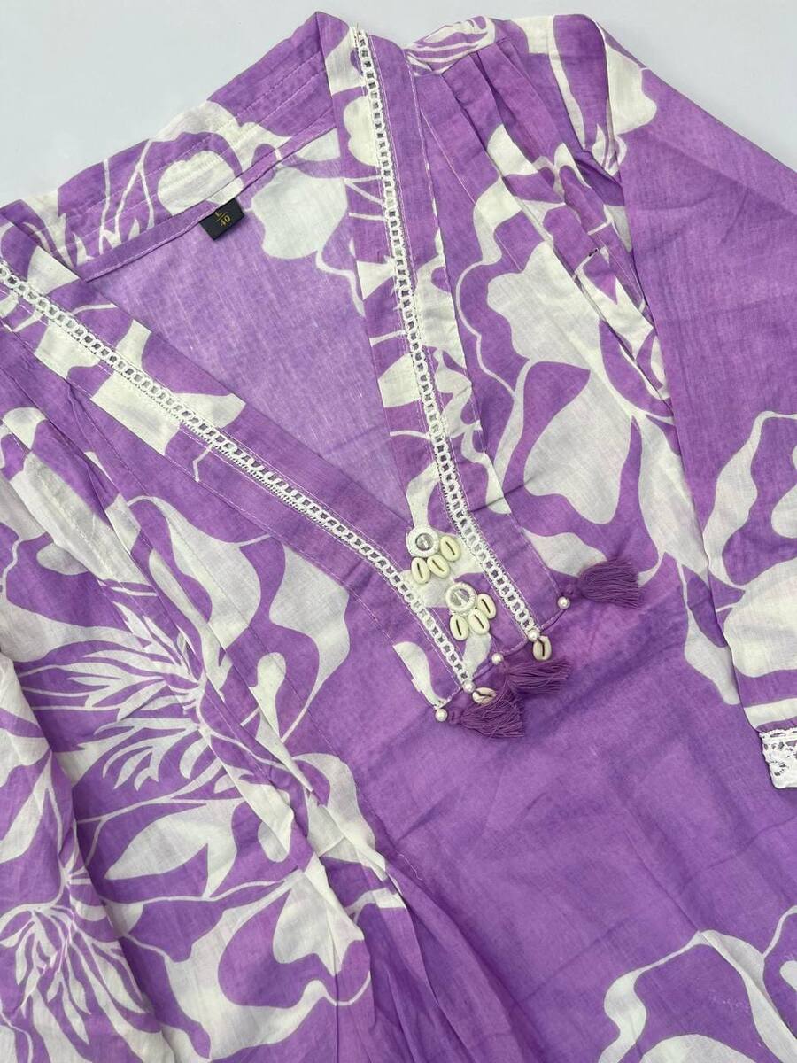 DESIGNER COTTON PRINTED EMBROIDERY HAND WORK NECK DESIGN CO-ORD SET LAVENDER