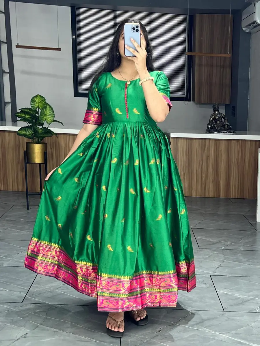 DESIGNER COTTON SILK BUTTI WITH WEAVING BORDER WORK GOWN HREEN