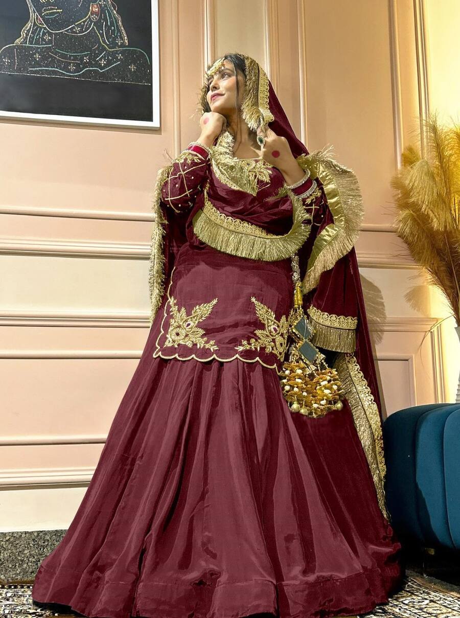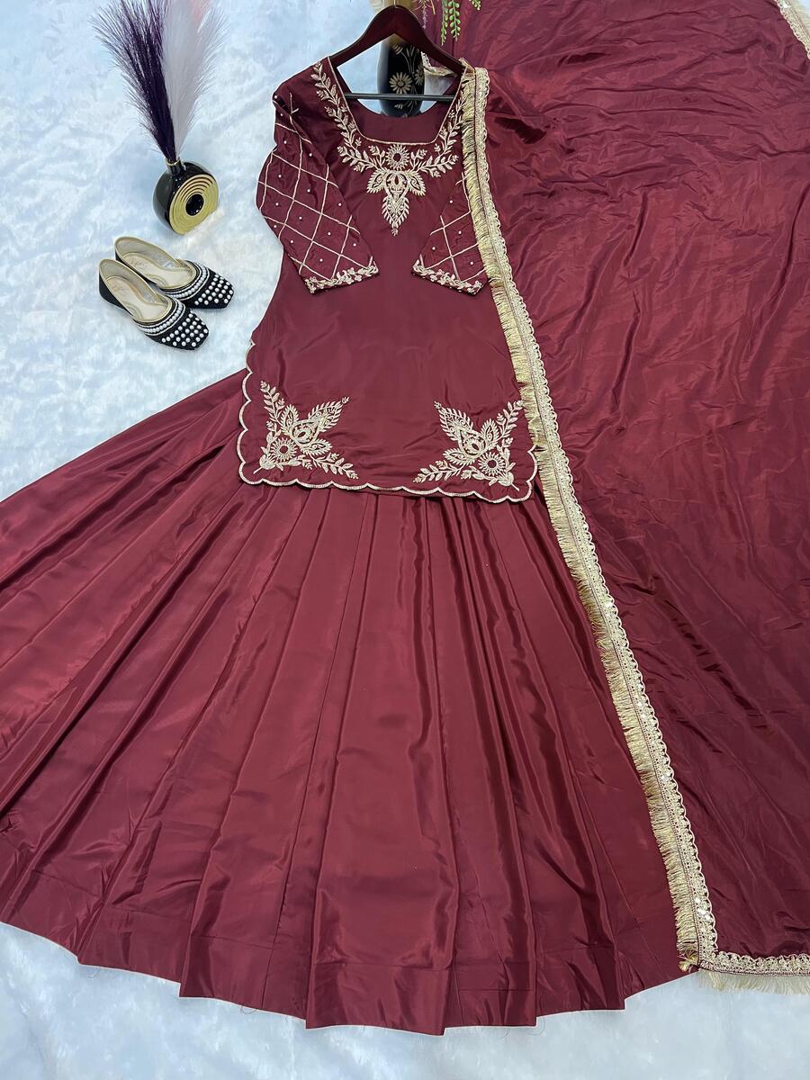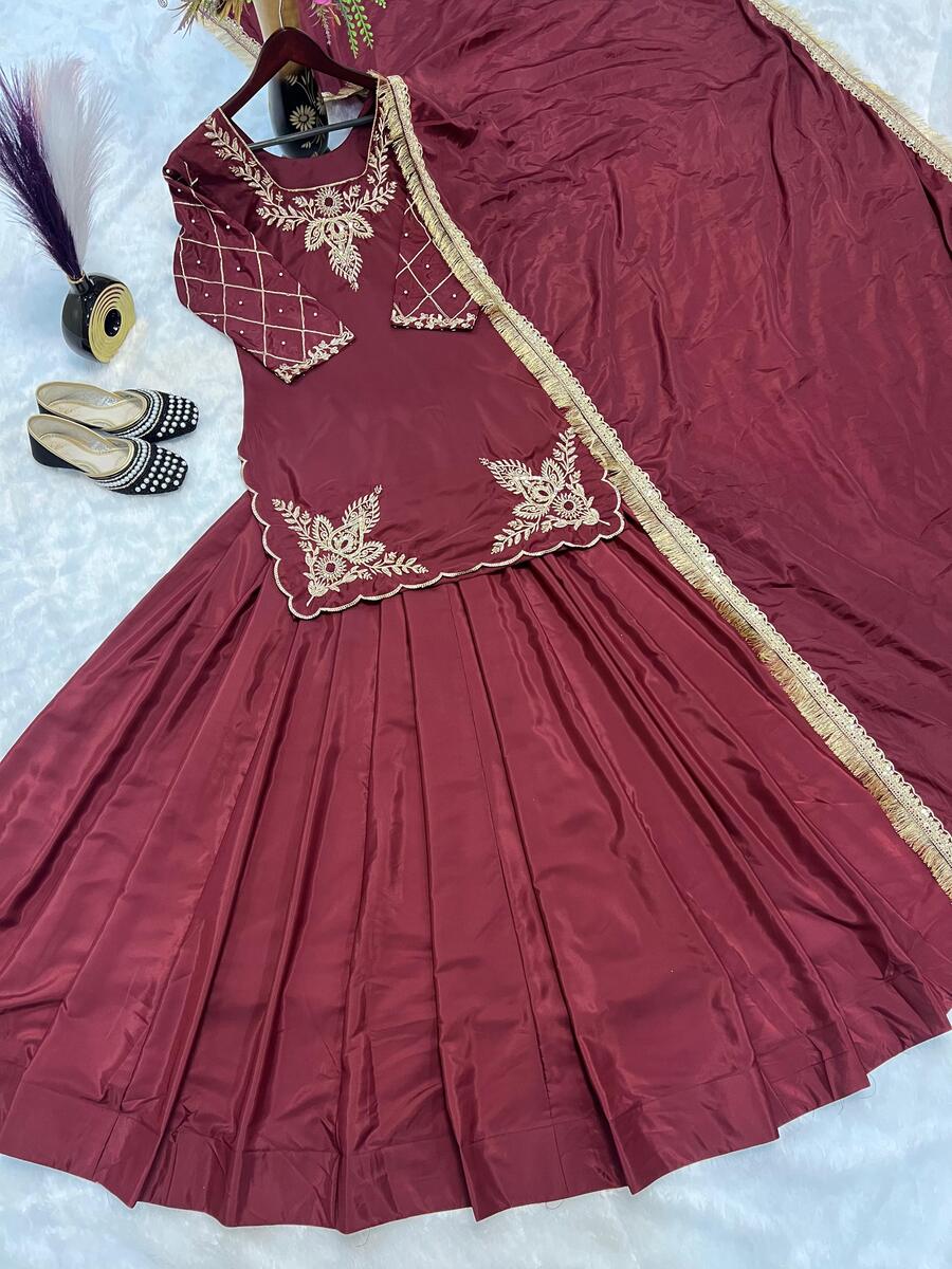 DESIGNER CREEP SILK BEADS HAND WORK WITH SEQUENCE MULTI NEEDLE EMBROIDERY AND ZARI WORK TOP LEHENGA WITH DUPATTA MAROON