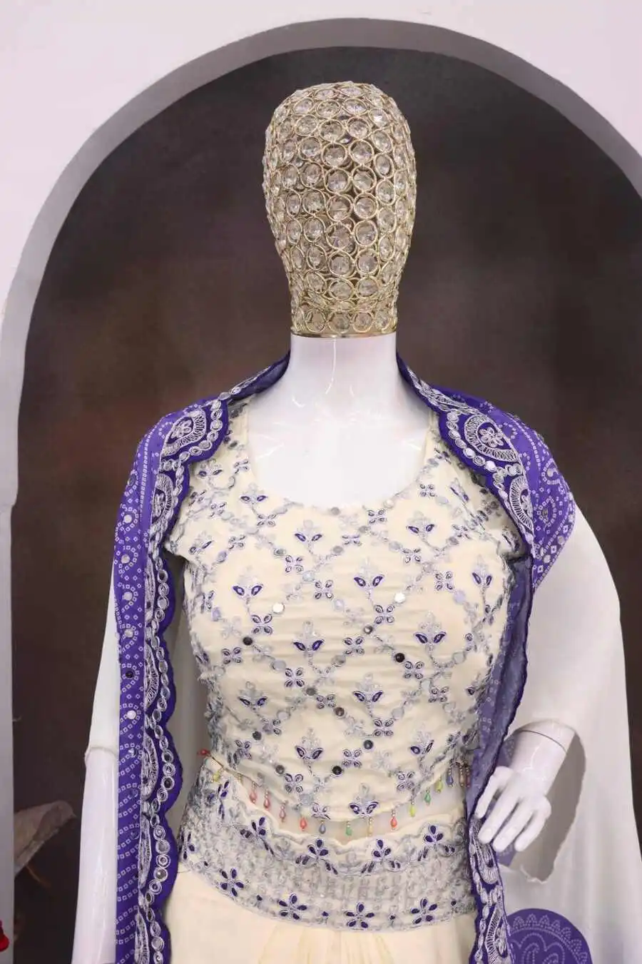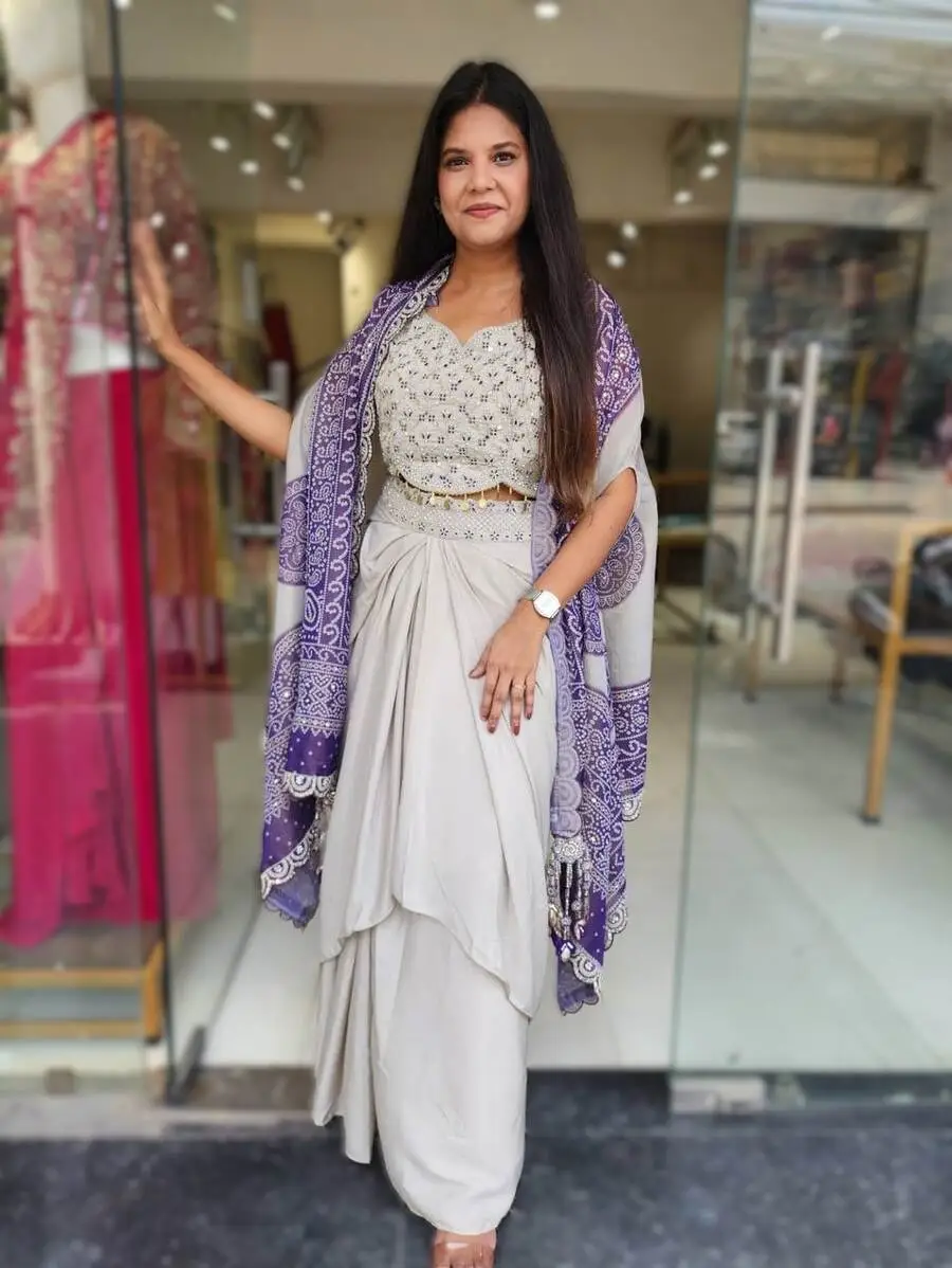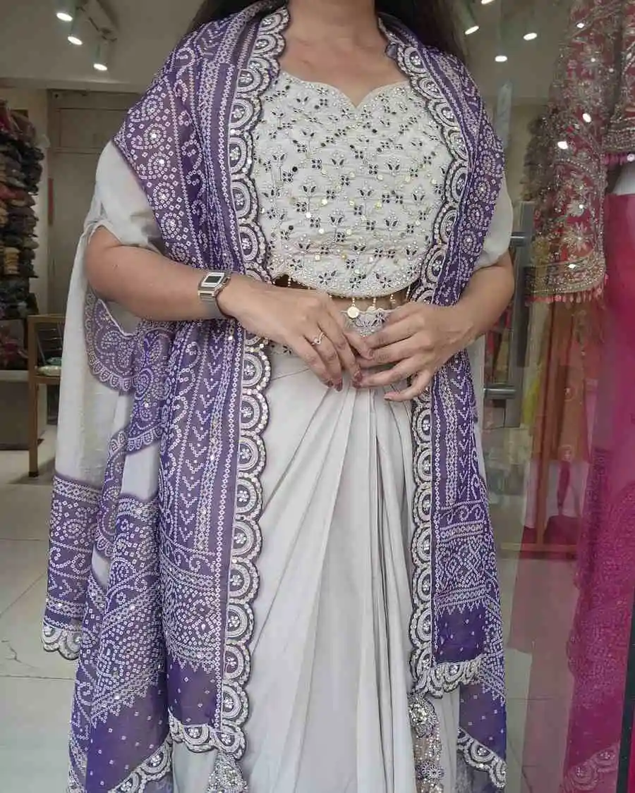 DESIGNER CREEP SILK EMBROIDERY SEQUENCE WITH REAL MIRROR WORK DRAPE SKIRT BLOUSE AND SHRUG PURPLE