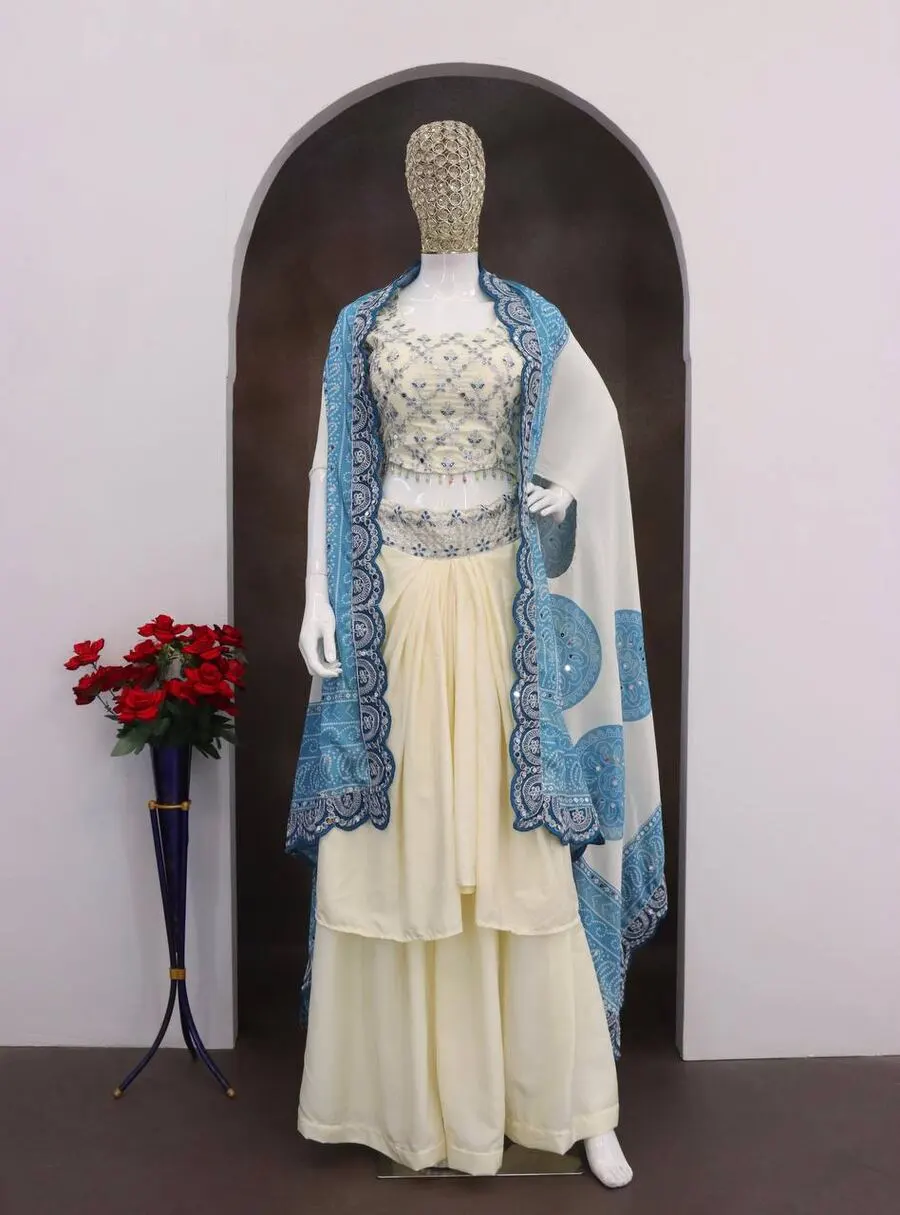 DESIGNER CREEP SILK EMBROIDERY SEQUENCE WITH REAL MIRROR WORK DRAPE SKIRT BLOUSE AND SHRUG SKY
