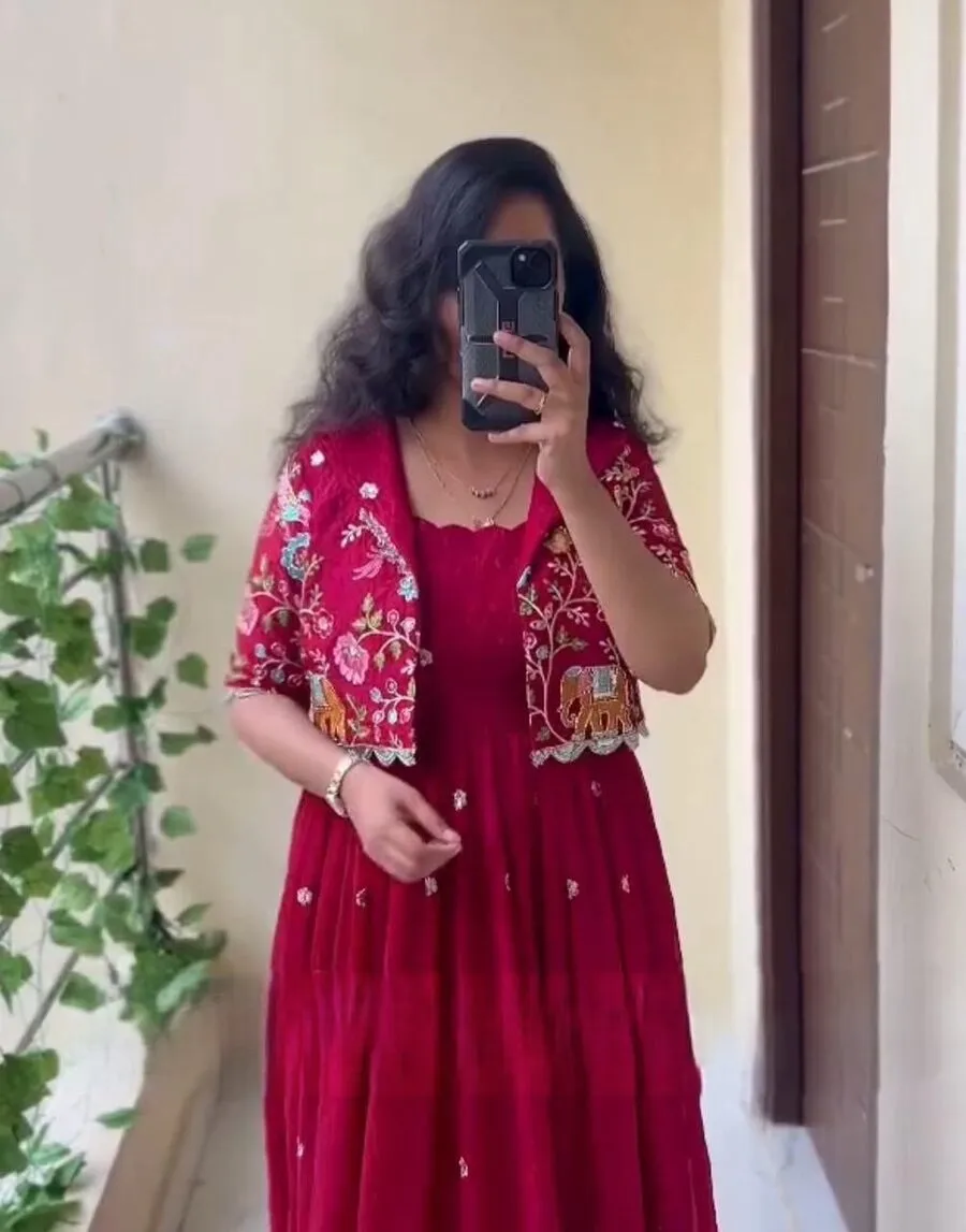 GOWN FABRIC :- HEAVY FAUX GORGETTE EMBROIDERY MIROR WORK IN FRONT