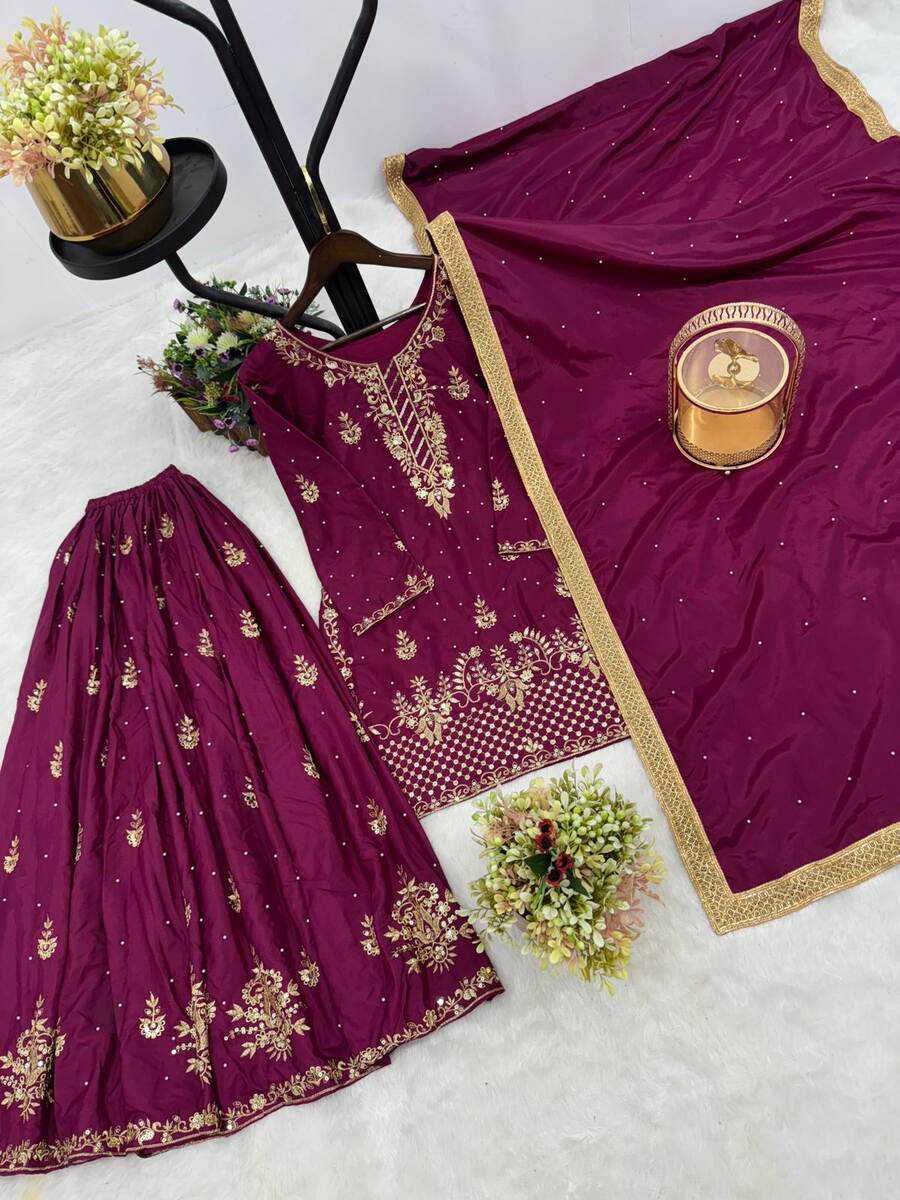 DESIGNER CREPE SILK EMBROIDERY AND SEQUENCE WORK WITH RIVETED MOTI WORK TOP PALAZZO WITH DUPATTA WINE