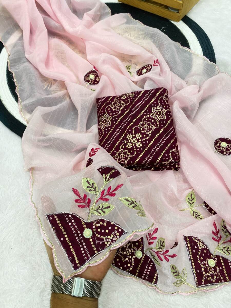 WORK :- RAYON BANDHANI PATCH BUTTA WITH HANDWORK