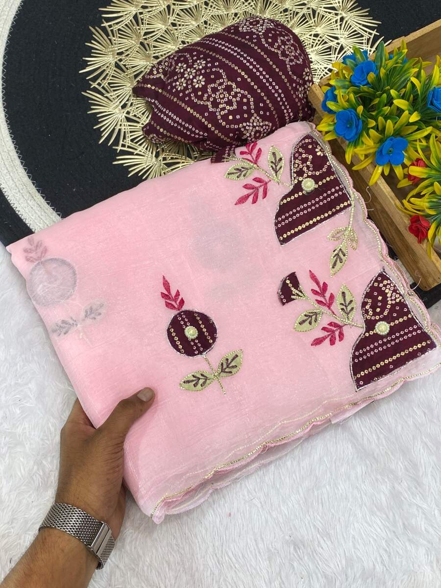 DESIGNER CRUNCHY CHIFFON BANDHANI PATCH BUTTA WITH HANDWORK SAREE WITH UNSTITCHED BLOUSE BABY PINK