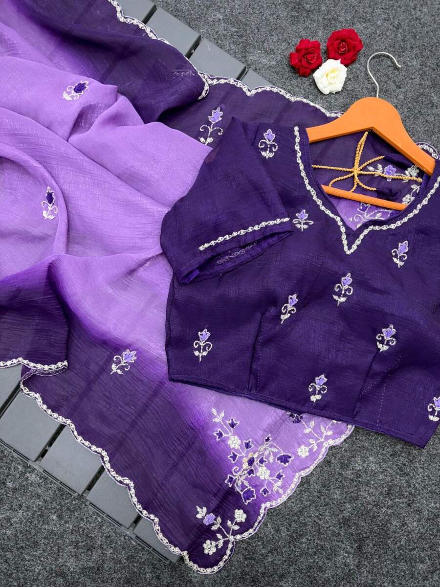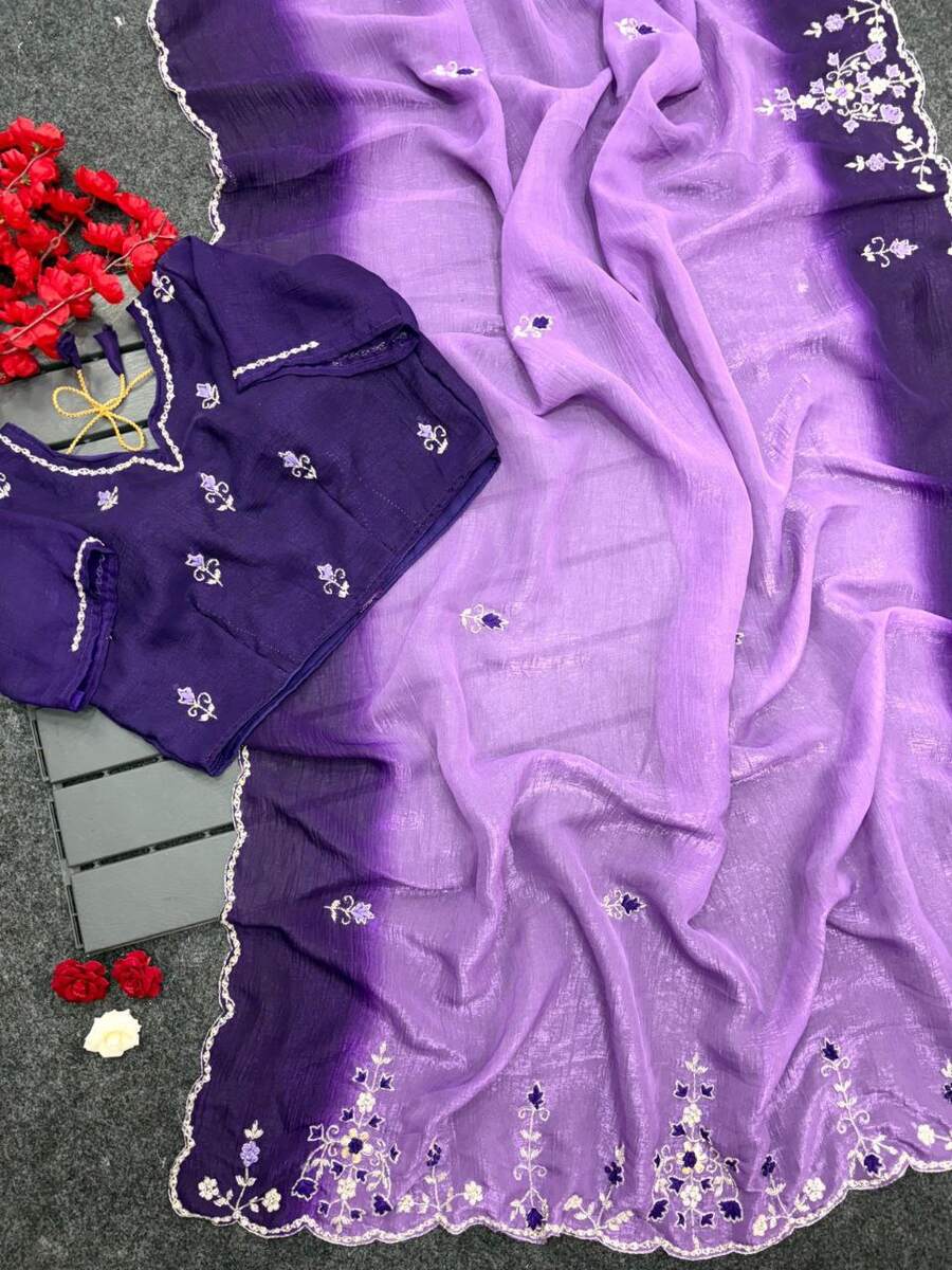 DESIGNER CRUNCHY CHIFFON BEADS AND MOTI HANDWORK WITH TREAD HAND WORK AND BUTTI WORK SAREE WITH UNSTITCHED BLOUSE PURPLE AND LAVENDER