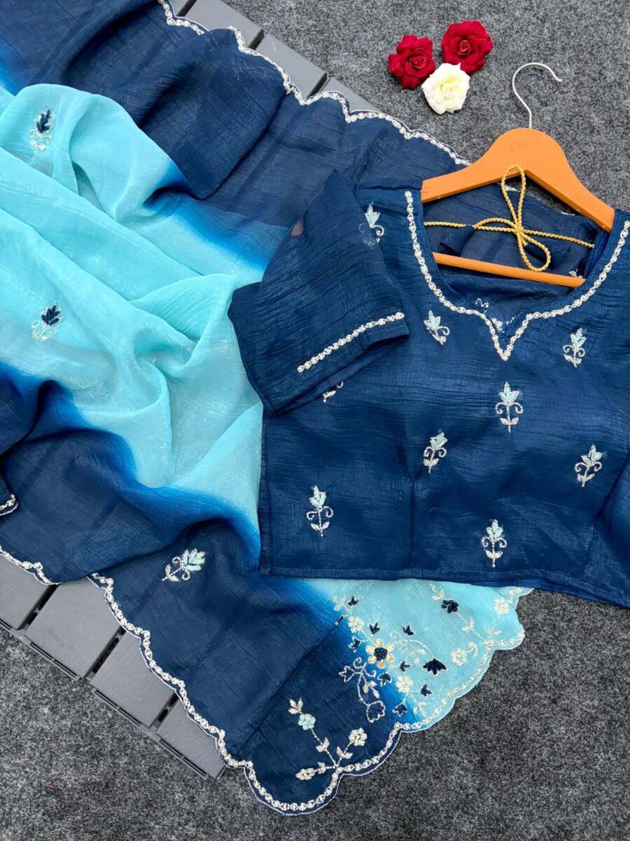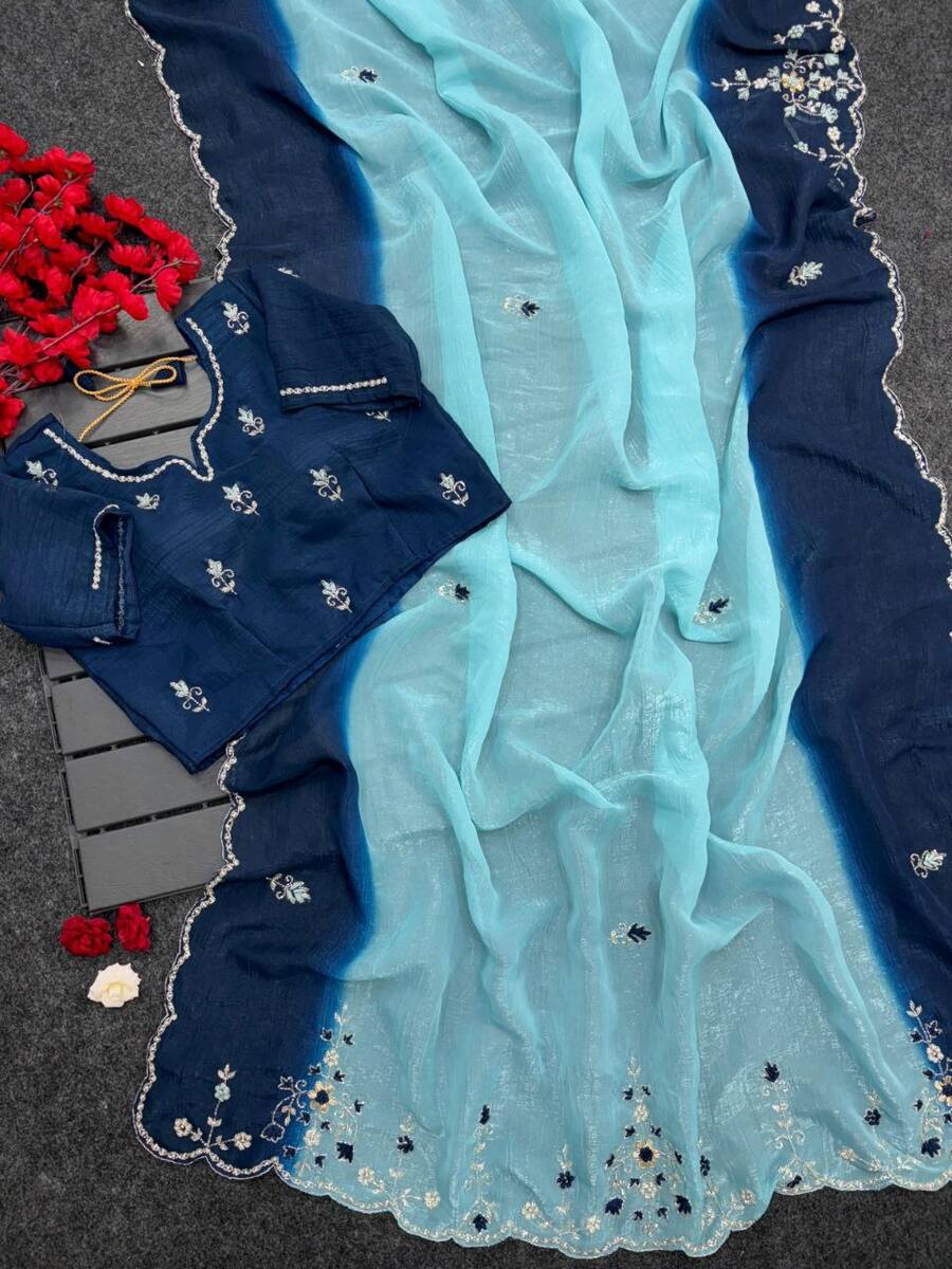 DESIGNER CRUNCHY CHIFFON BEADS AND MOTI HANDWORK WITH TREAD HAND WORK AND BUTTI WORK SAREE WITH UNSTITCHED BLOUSE SKY AND BLUE