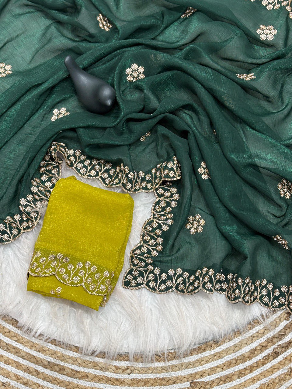 DESIGNER CRUNCHY CHIFFON EMBROIDERY AND BOTH HAND MOTI WORK & DIAMOND WORK SAREE WITH UNSTITCHED BLOUSE GREEN
