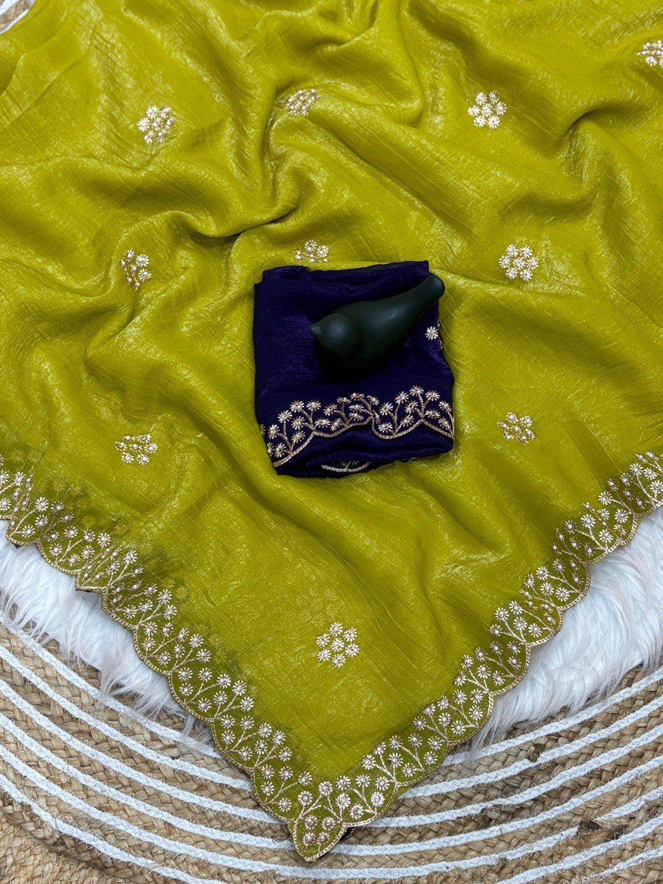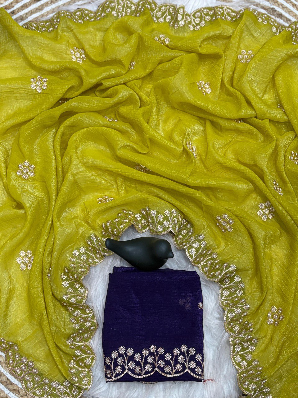 SAREE FABRIC : PURE SOFT JIMMY CHOO WITH HEAVY EMBROIDERY MULTI TREADS , CODING & SEQUENCE WORK & FANCY CUT WORK BORDER