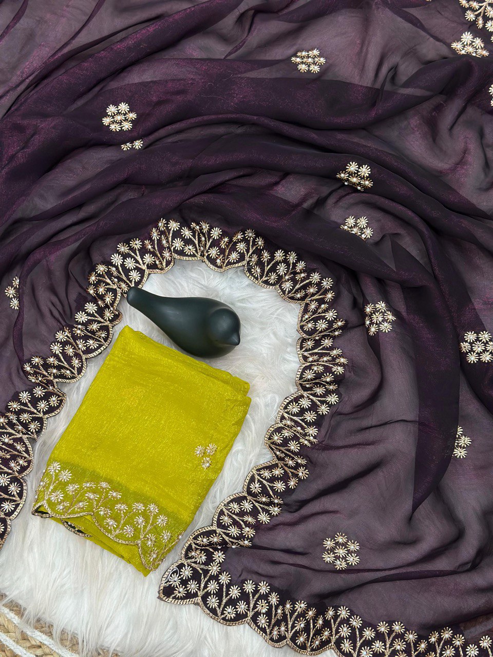 SAREE FABRIC : PURE SOFT JIMMY CHOO WITH HEAVY EMBROIDERY MULTI TREADS , CODING & SEQUENCE WORK & FANCY CUT WORK BORDER