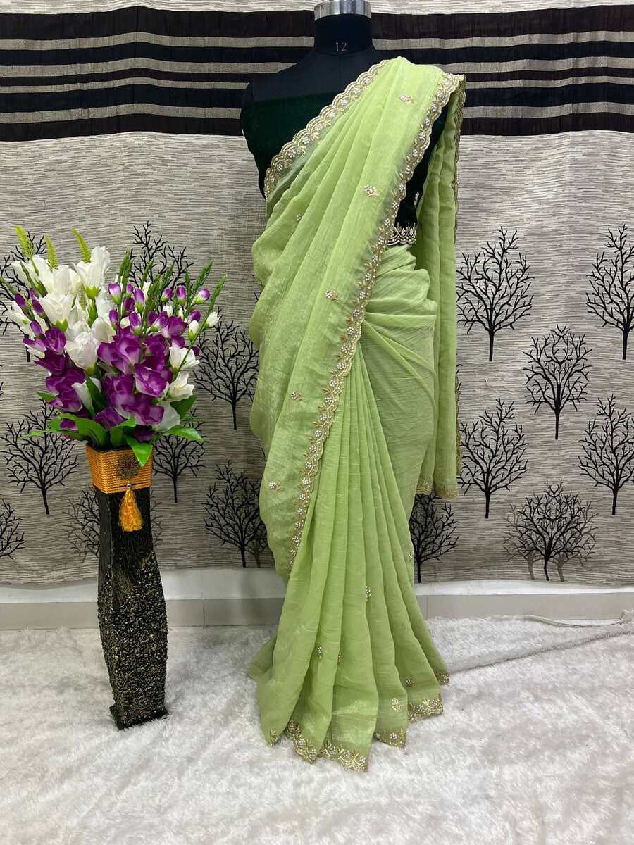 SAREE FABRIC : PURE SOFT JIMMY CHOO WITH HEAVY EMBROIDERY MULTI TREADS , CODING & SEQUENCE WORK & FANCY CUT WORK BORDER