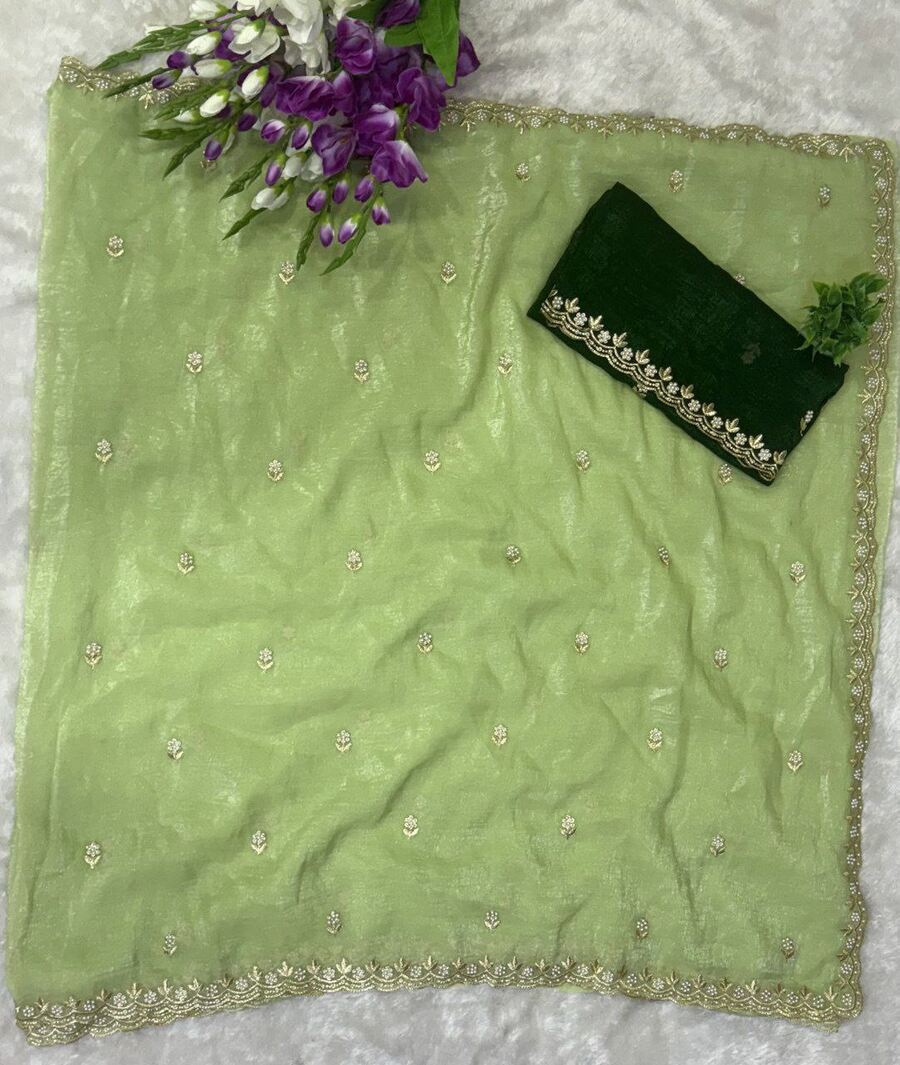 DESIGNER CRUNCHY EMBROIDERY WITH MOTI DIAMOND WORK SAREE WITH UNSTITCHED BLOUSE PISTA