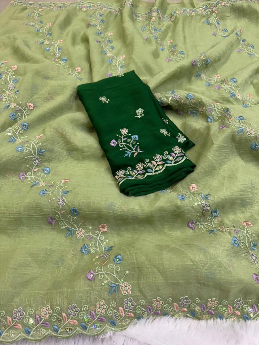 SAREE FABRIC : PREMIUM DIAMOND CHINON SILK WITH HEAVY EMBROIDERY CODING MULTI TREADS AND SEQUENCE WORK