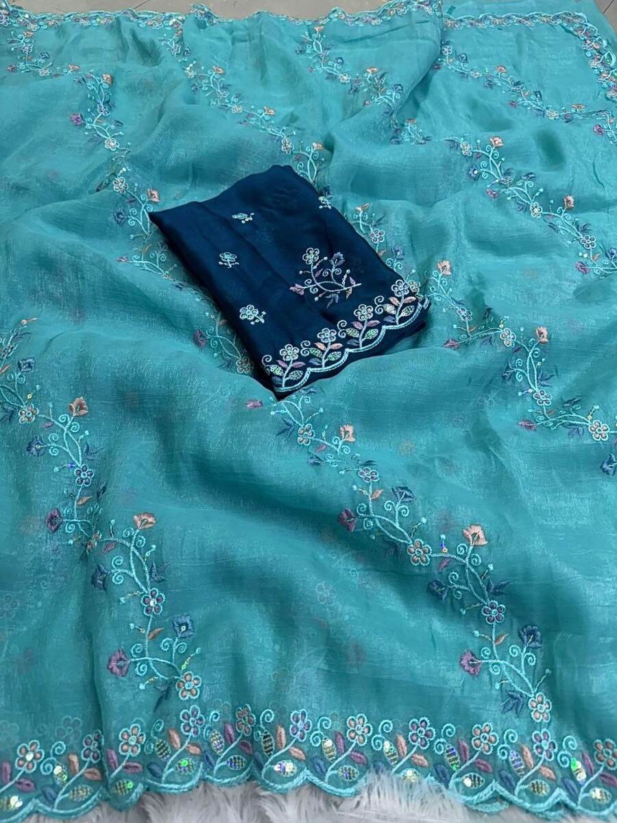 SAREE FABRIC : PURE SOFT JIMMY CHO WITH HEAVY EMBROIDERY MULTI THREAD , CODING AND SEQUENCE WORK AND FANCY CUT WORK IN WORK WITH PIPING BORDER