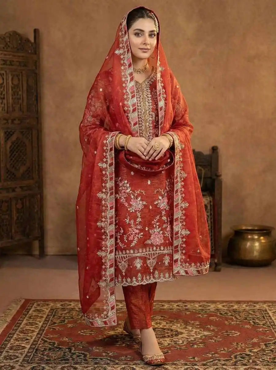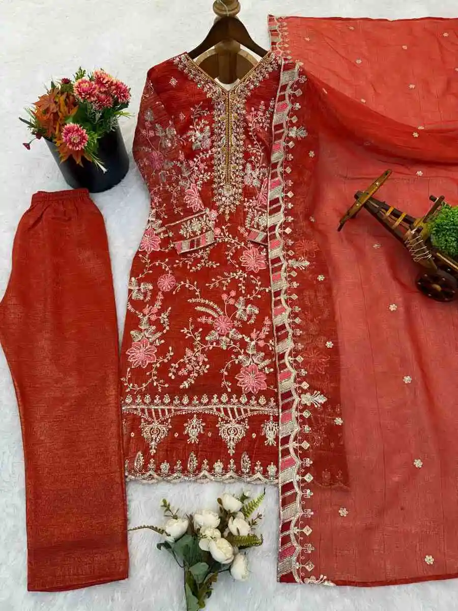 DESIGNER CRUNCHY SILK EMBROIDERY SEQUENCE WORK TOP BOTTOM WITH DUPATTA ORANGE