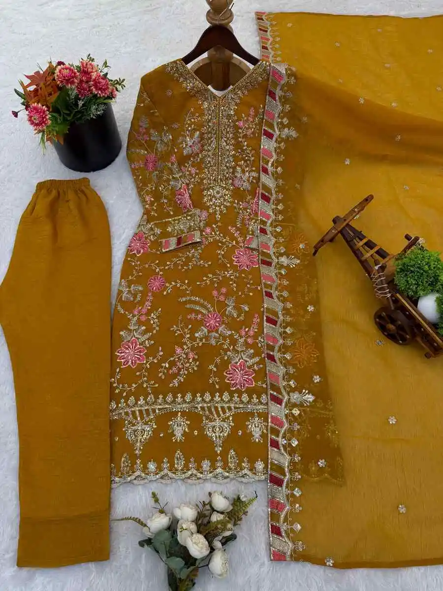 DESIGNER CRUNCHY SILK EMBROIDERY SEQUENCE WORK TOP BOTTOM WITH DUPATTA YELLOW