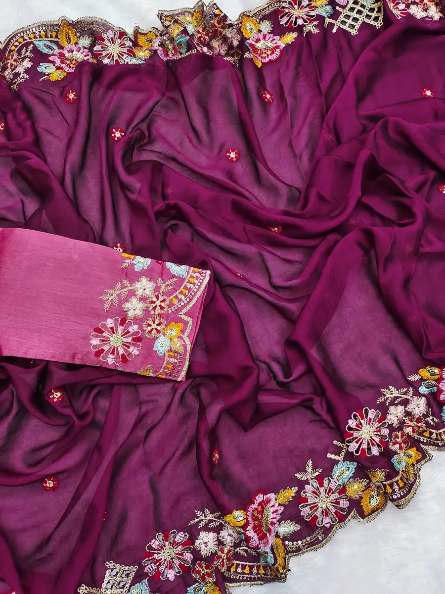 SAREE FABRIC : PURE SOFT JIMMY CHOO WITH HEAVY EMBROIDERY MULTI TREADS , CODING & SEQUENCE WORK & FANCY CUT WORK BORDER