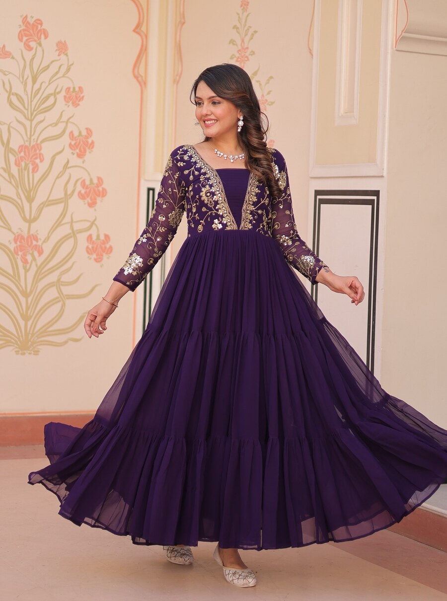 DESIGNER FAUX BLOOMING SEQUENCE & ZARI EMBROIDERY WORK GOWN PURPLE