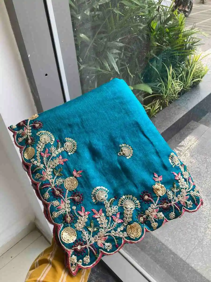 SAREE FABRIC : PURE SOFT JIMMY CHOO WITH HEAVY EMBROIDERY MULTI TREADS , CODING & SEQUENCE WORK & FANCY CUT WORK BORDER