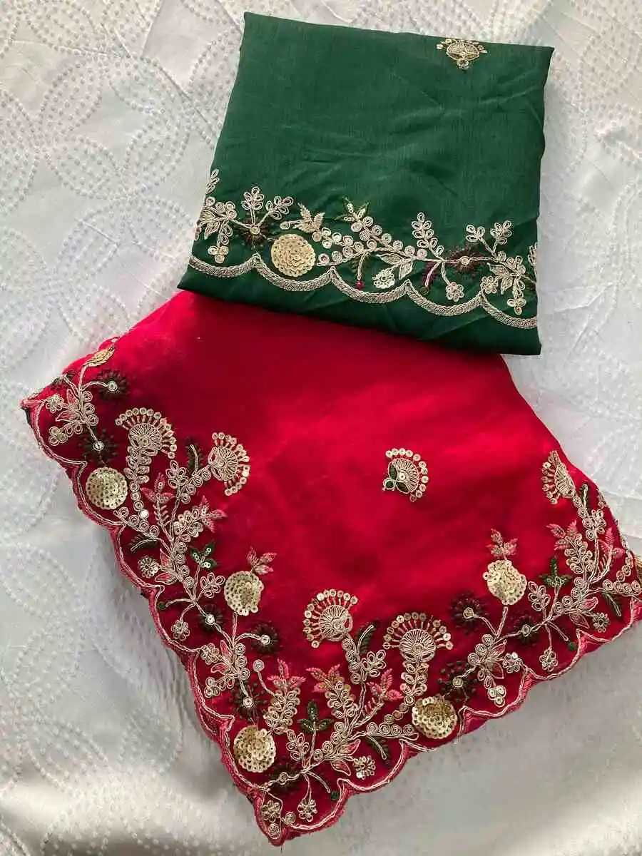DESIGNER FENDY CHIFFON EMBROIDERY CUTWORK WORK AARC BORDER WORK SAREE WITH UNSTITCHED BLOUSE RED
